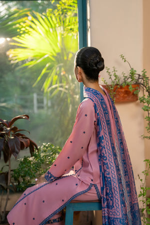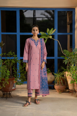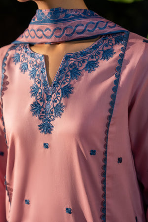 The soft mauve-pink base is beautifully contrasted with intricate navy blue embroidery that highlights the neckline, sleeves, and trouser hem