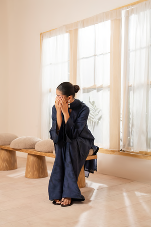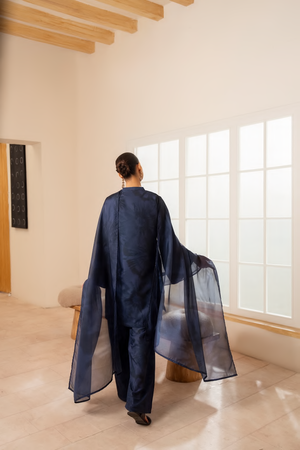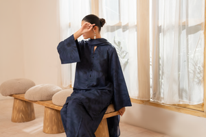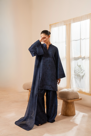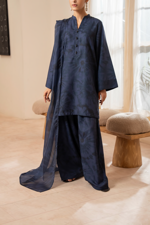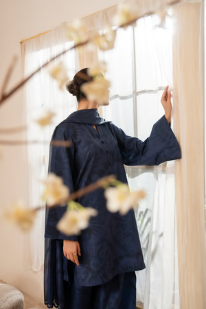 The kurta showcases a subtle self-print with d e l i c a t e floral textures, offering a refined, minimal look.
