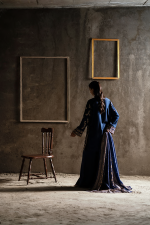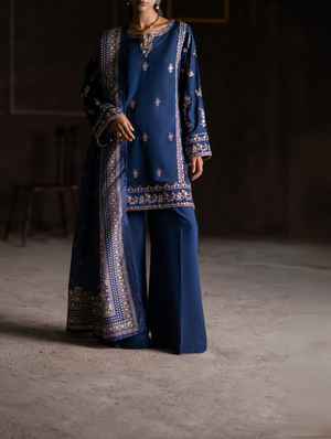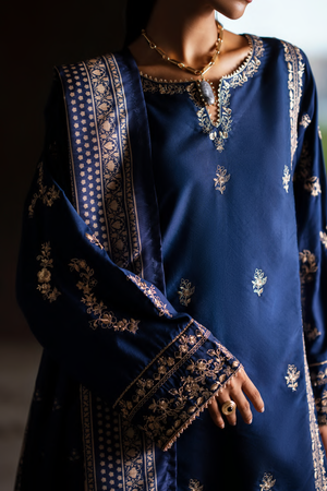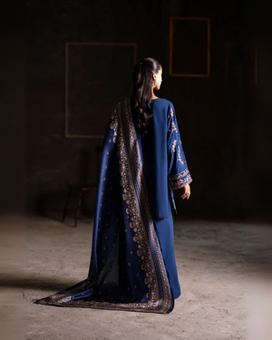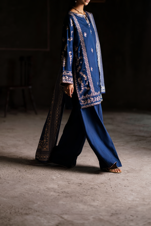 This deep navy blue three-piece set gracefully unites elegance with tradition. The long straight shirt is embellished with intricate golden thread embroidery, featuring floral and ornamental motifs that accentuate the neckline, sleeves, and borders with timeless sophistication.