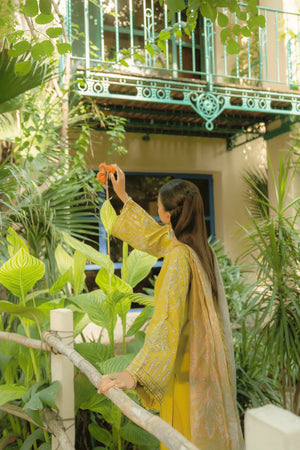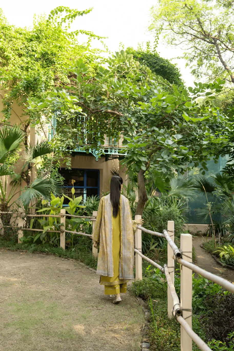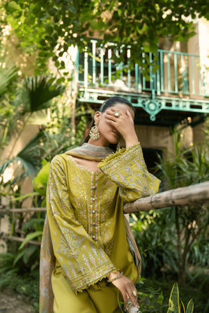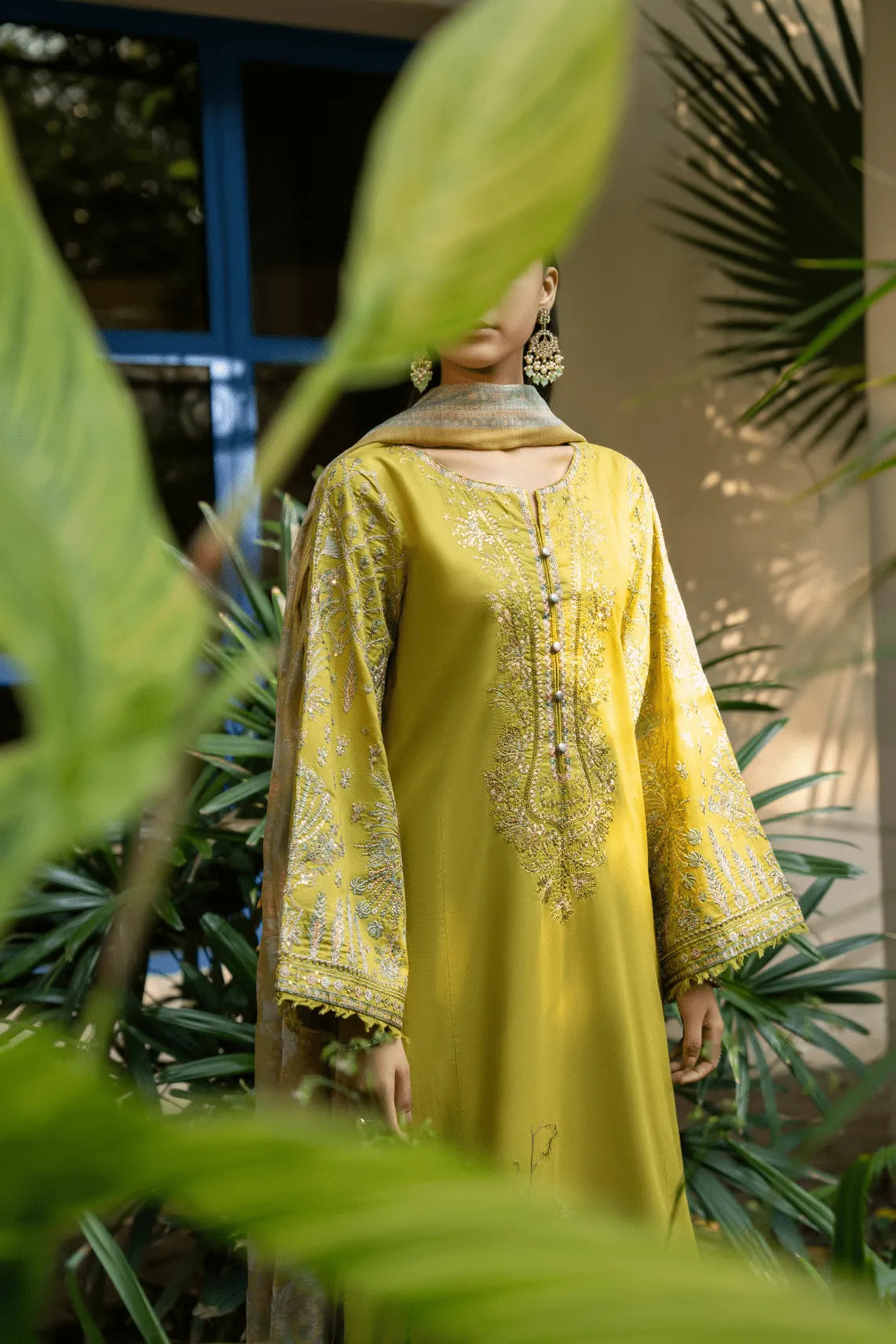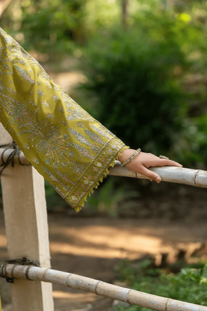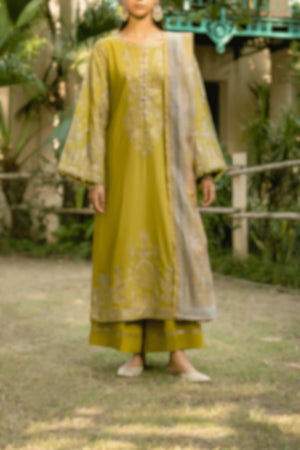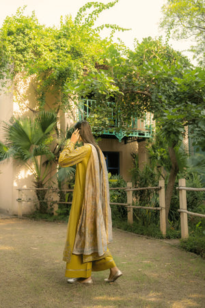 This ensemble is a refined premium linen outfit in a captivating olive-mustard shade, adorned with exquisite threadwork embroidery. The kurta showcases delicate floral and ornamental motifs along the neckline, sleeves, and hemline, reflecting a timeless sense of artistry and craftsmanship.