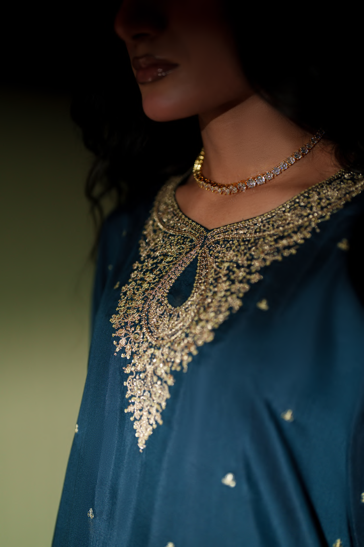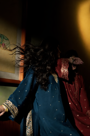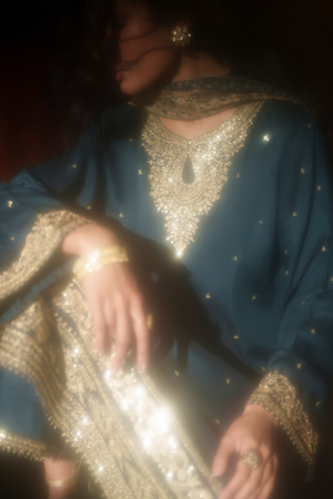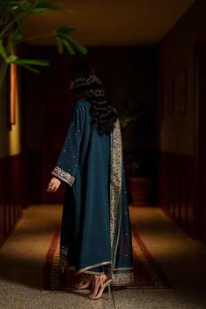 The finely tailored 3-piece outfit features a delicately detailed shirt paired with a sleek trouser and a coordinated dupatta, creating a harmonious balance between structure and softness. Every element is thoughtfully crafted to deliver timeless sophistication, making Opaline an ideal choice for festive evenings and elegant occasions.