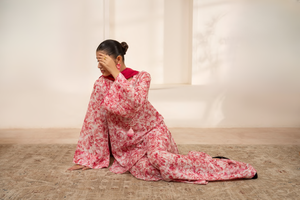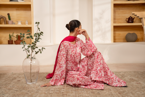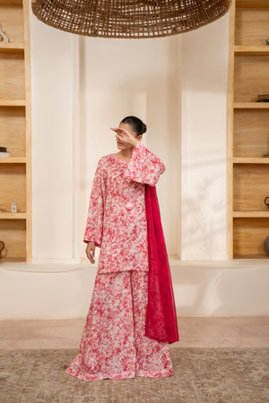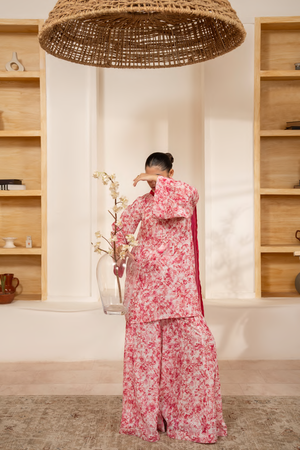 The kurta features a romantic marbled floral pattern that exudes femininity, paired with a wide-legged two-leg palazzo for graceful movement and comfort .