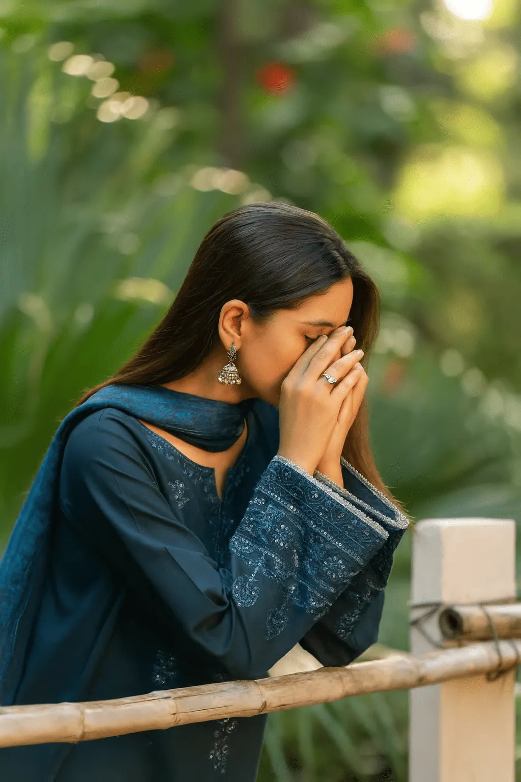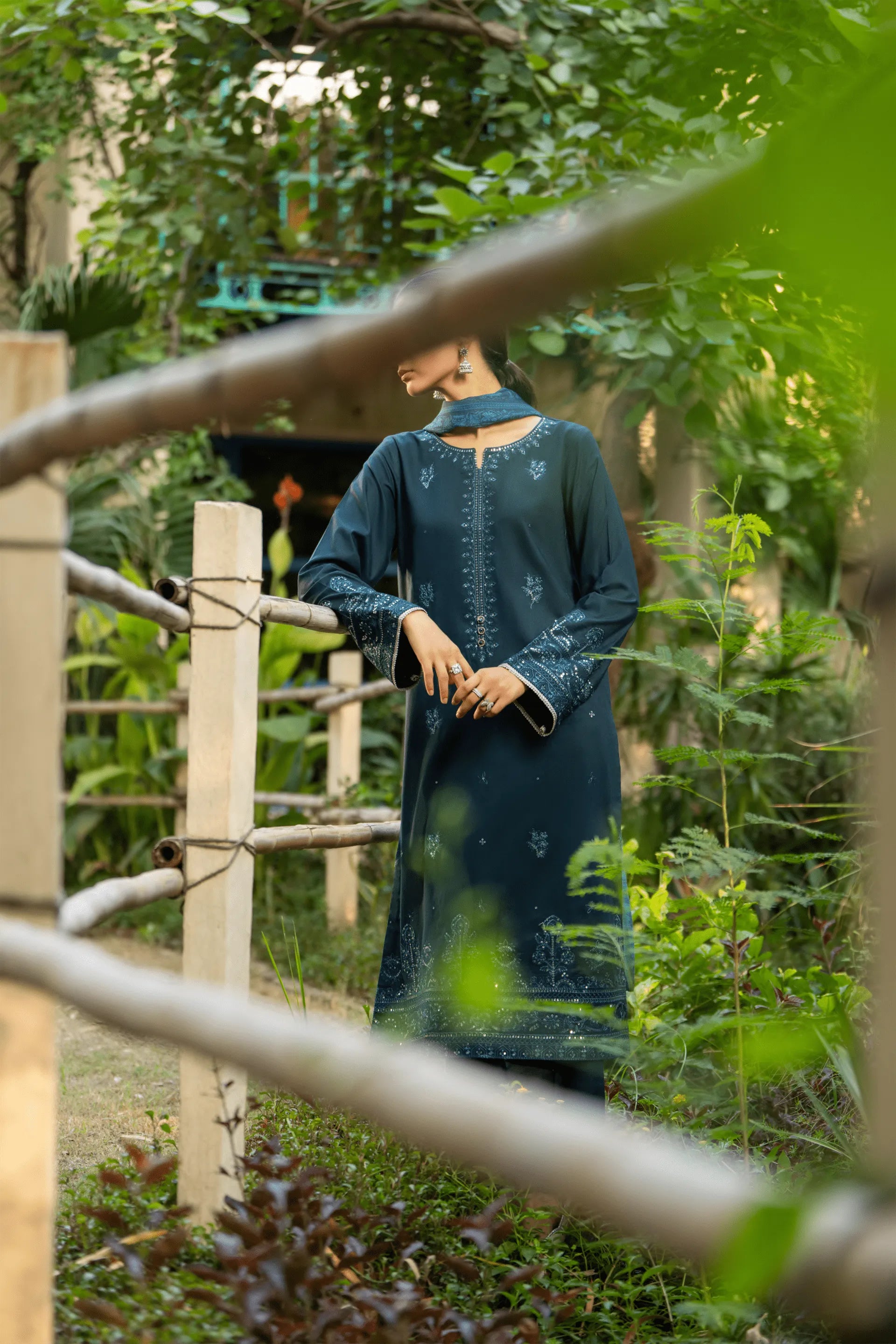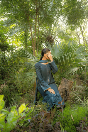 A deep teal ensemble that shimmers with tone-on-tone embroidery and delicate sequin artistry. The flowing kurta paired with wide culottes crafts an elegant silhouette with a distinctly contemporary edge.
