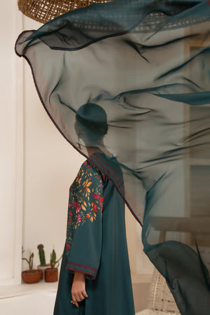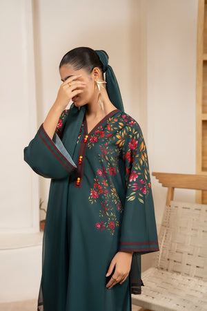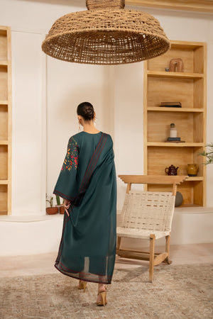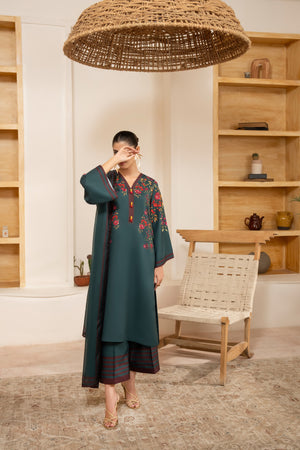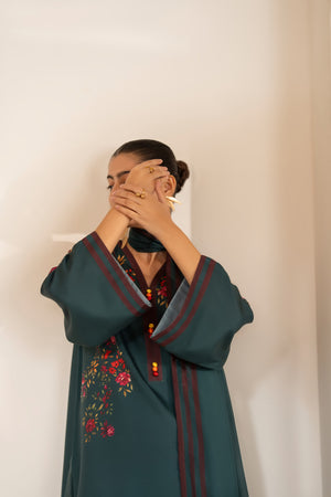 A refined deep green ensemble exuding timeless grace, with the kurta blooming in bold red and mustard floral embroidery.