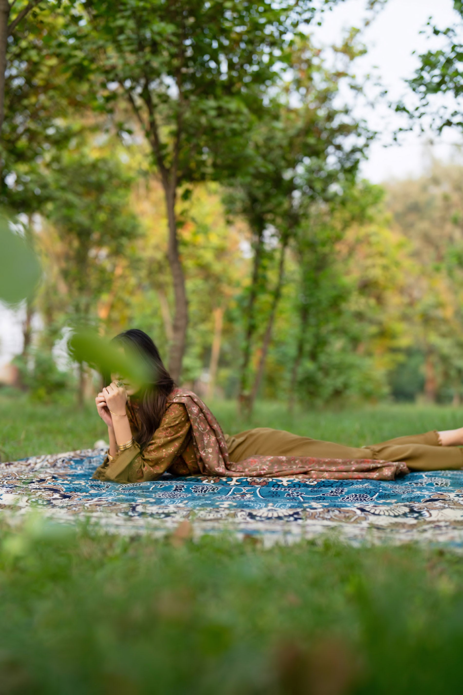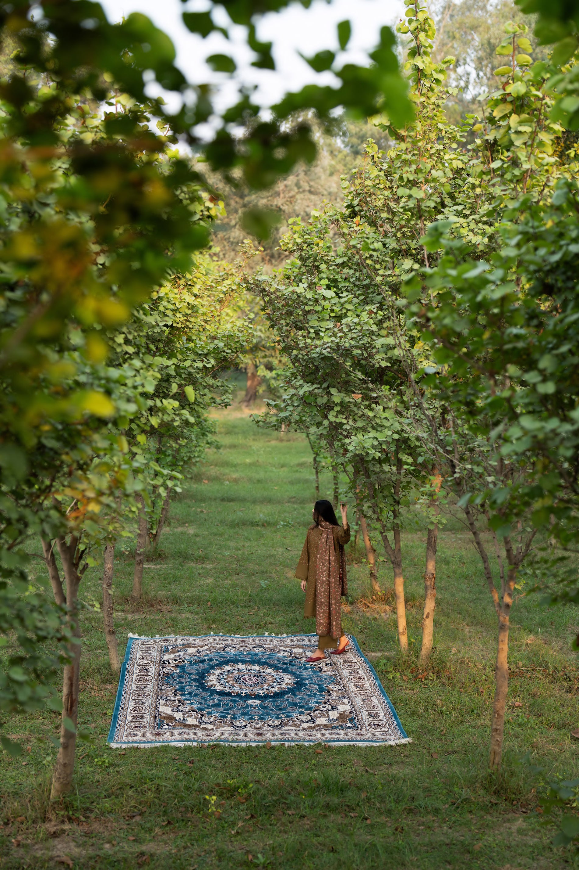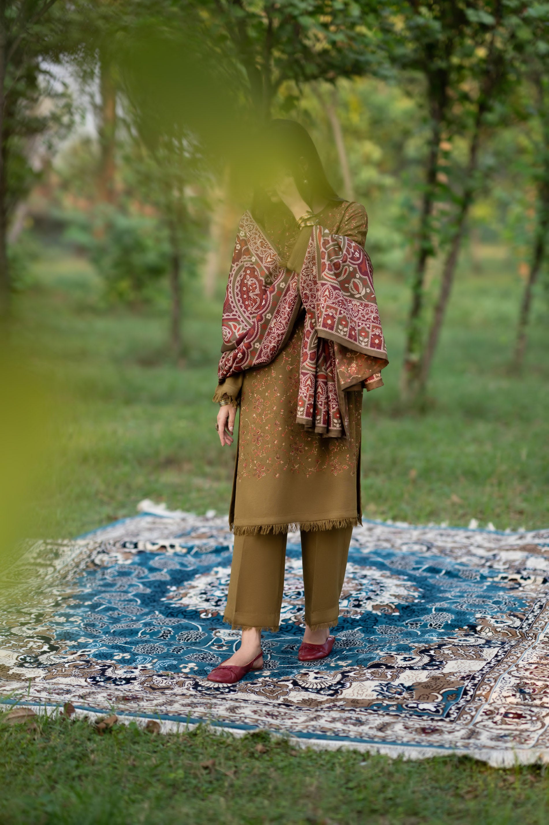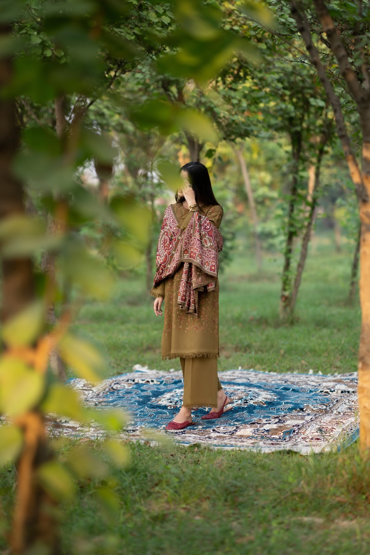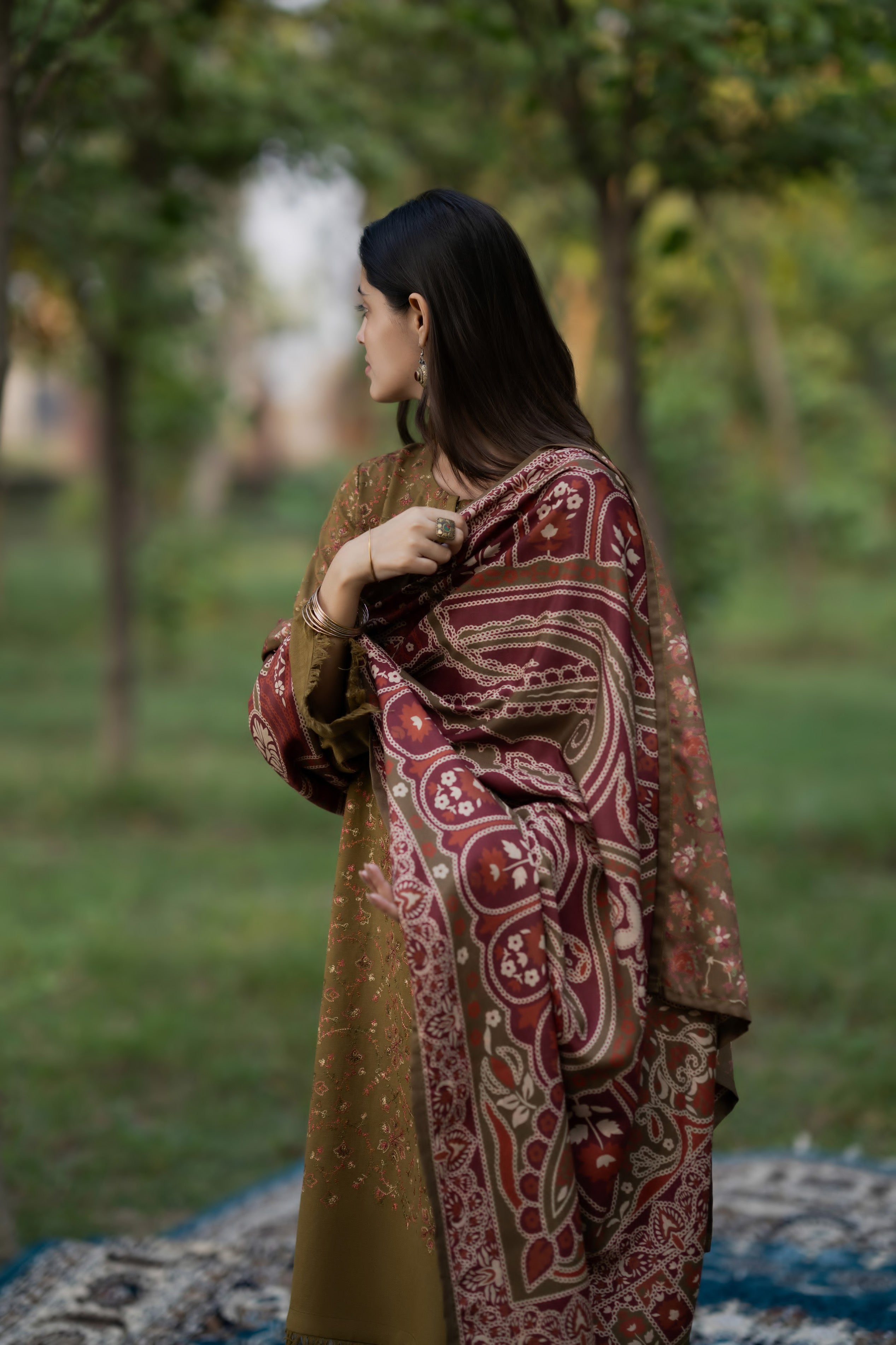 patterns, the look captures both warmth and mystery.