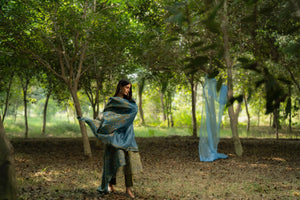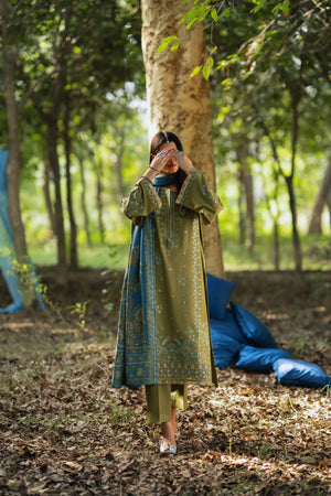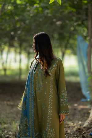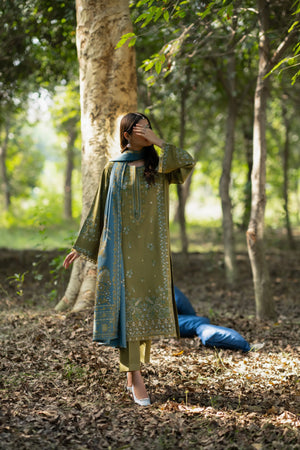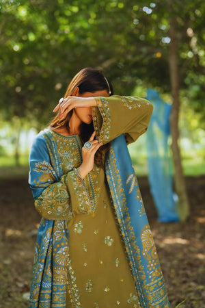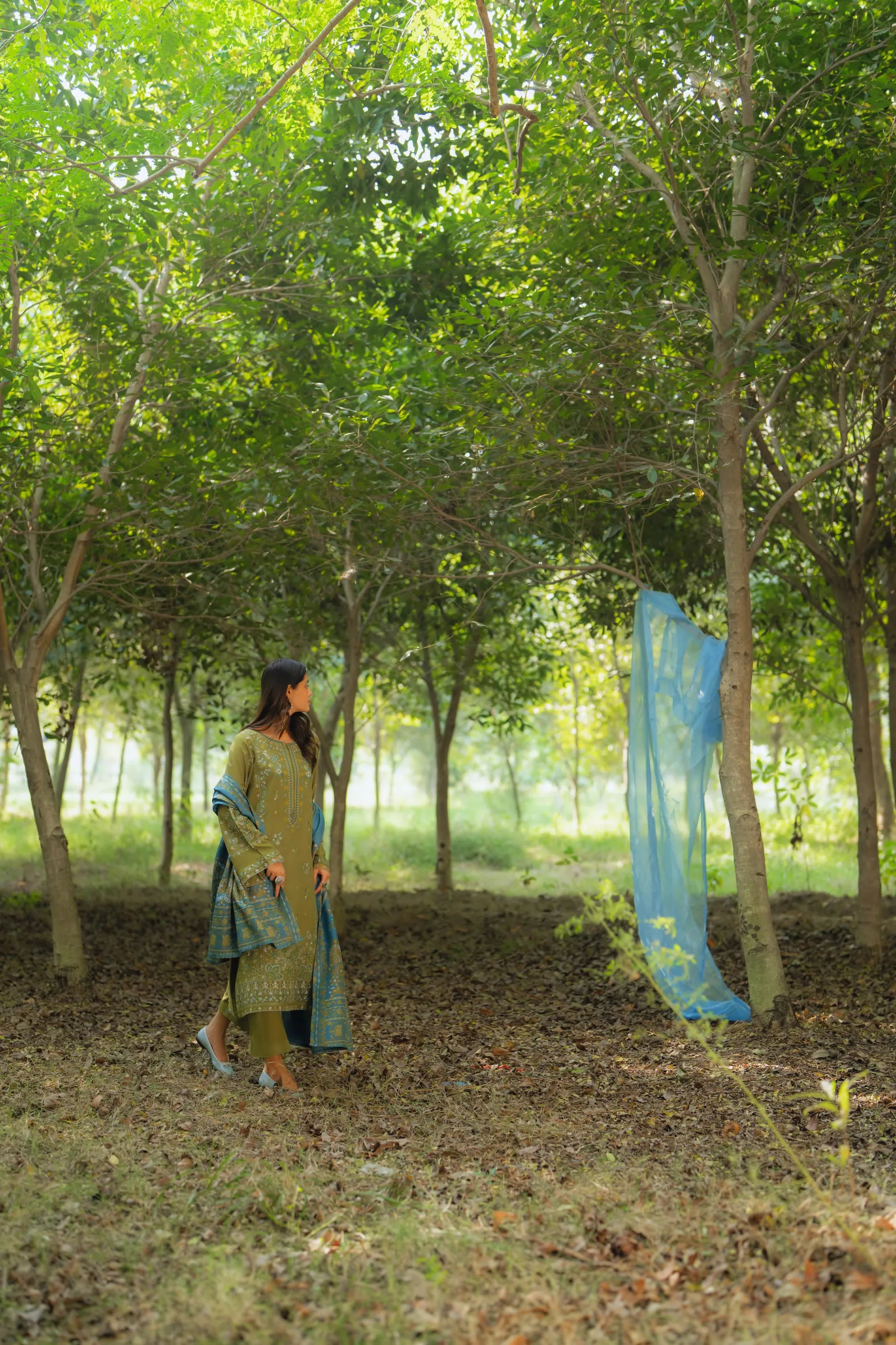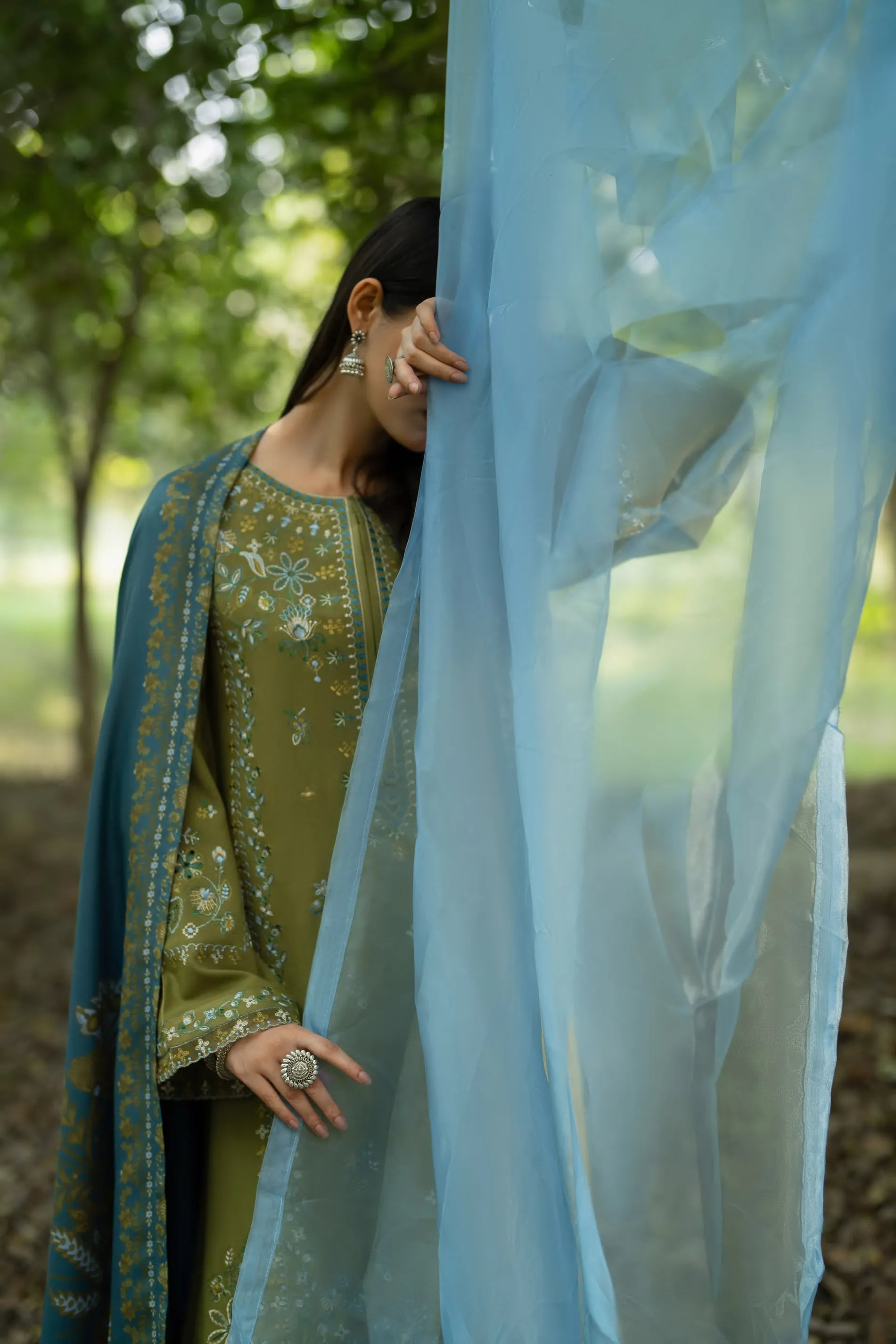 A winter three-piece in warm olive, finished with pale-blue and soft-gold embroidery. The straight kurta features a rounded neckline with a slim embroidered front panel, scattered floralsacross the body, ornate cuff borders, and a denser floral hem for balance.