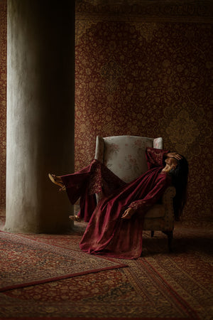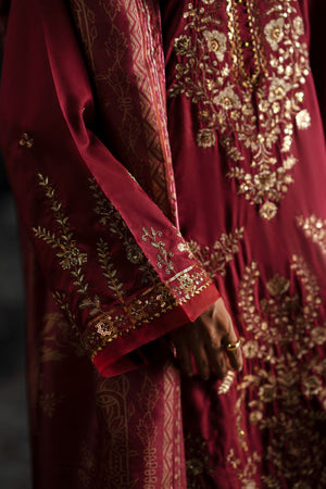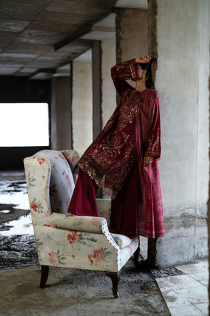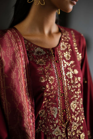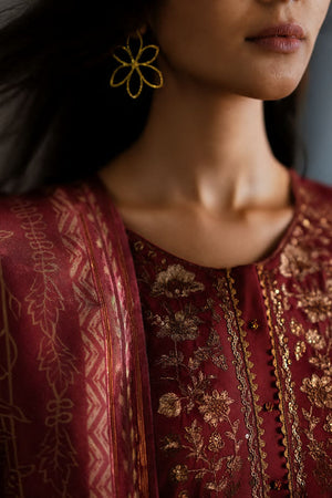 The long maroon kameez is elegantly embellished with intricate gold embroidery, gracefully accentuating the neckline, sleeves, and hemline for a regal charm. Its dupatta, adorned with finely detailed borders and delicate motifs, enhances the ensemble with depth and continuity. Complemented by wide-leg trousers that strike the perfect blend of tradition and modernity, this look radiates timeless sophistication. Paired with statement jewelry, it beautifully reflects cultural artistry with an aura of grandeur.