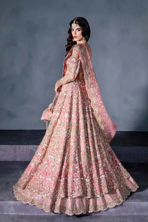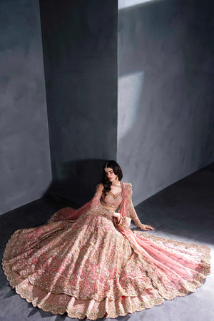Turn heads in this stunning blush pink bridal lehenga by Akbar Aslam, designed for the modern bride who embraces tradition with a contemporary flair. The intricately embellished choli features delicate beadwork and shimmering stones, perfectly balanced with full embroidered sleeves and a flattering neckline. The voluminous lehenga flows with grandeur, layered with detailed patterns and scalloped edges, while the sheer dupatta adds a soft, romantic touch with its glistening accents. Paired with a handcrafted pouch and traditional jewelry, this ensemble captures the essence of feminine elegance and festive glamour.