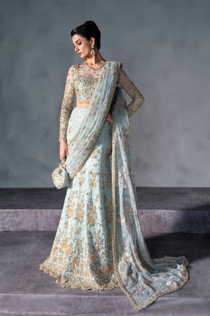 Exude refined elegance in this powder blue bridal lehenga by Akbar Aslam, designed for the bride who dares to be different. The ensemble features a delicately hand-embellished choli with sheer sleeves and soft floral motifs, paired with a graceful lehenga adorned in golden embroidery and sequin detailing. A flowy net dupatta with pastel floral accents adds a romantic dimension, while the matching handcrafted pouch completes the ethereal look. Light, dreamy, and modern—this design is perfect for daytime celebrations and intimate weddings.