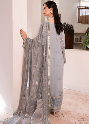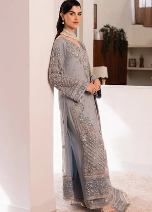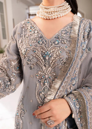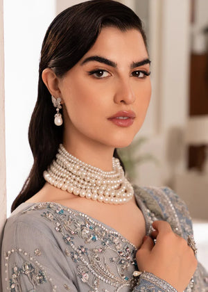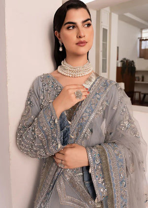Additional Description: Embroidered long shirt with stone and ada work on the front of the shirt. It comes with embroidered border trouser and an embroidered net Dupatta with pani work embellishment. The shirt is complemented with raw silk inner.