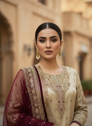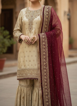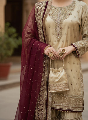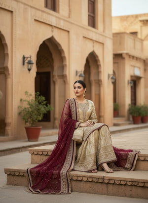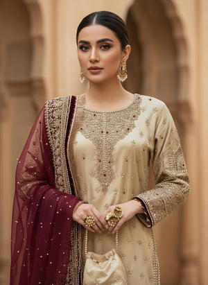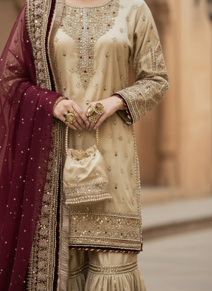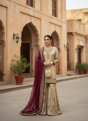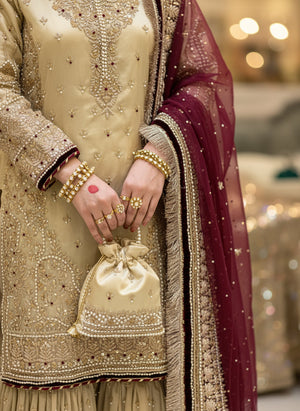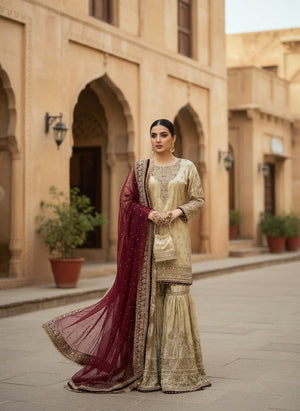 Experience the elegance of Golden handmade embroidered Ghararah - exclusively designed by Sherrys Wardrobe! This stunning Shirt is crafted from Tissue Masori fabric and adorned with intricate handwork embroideries. Paired with a flowy Organza dupatta featuring a heavy embroidered border, this ensemble is perfect for any occasion. Elevate your style and embrace luxury with Sherrys!