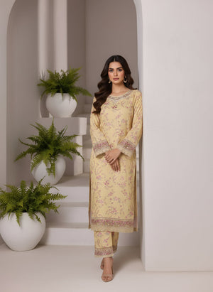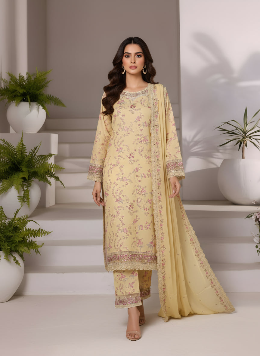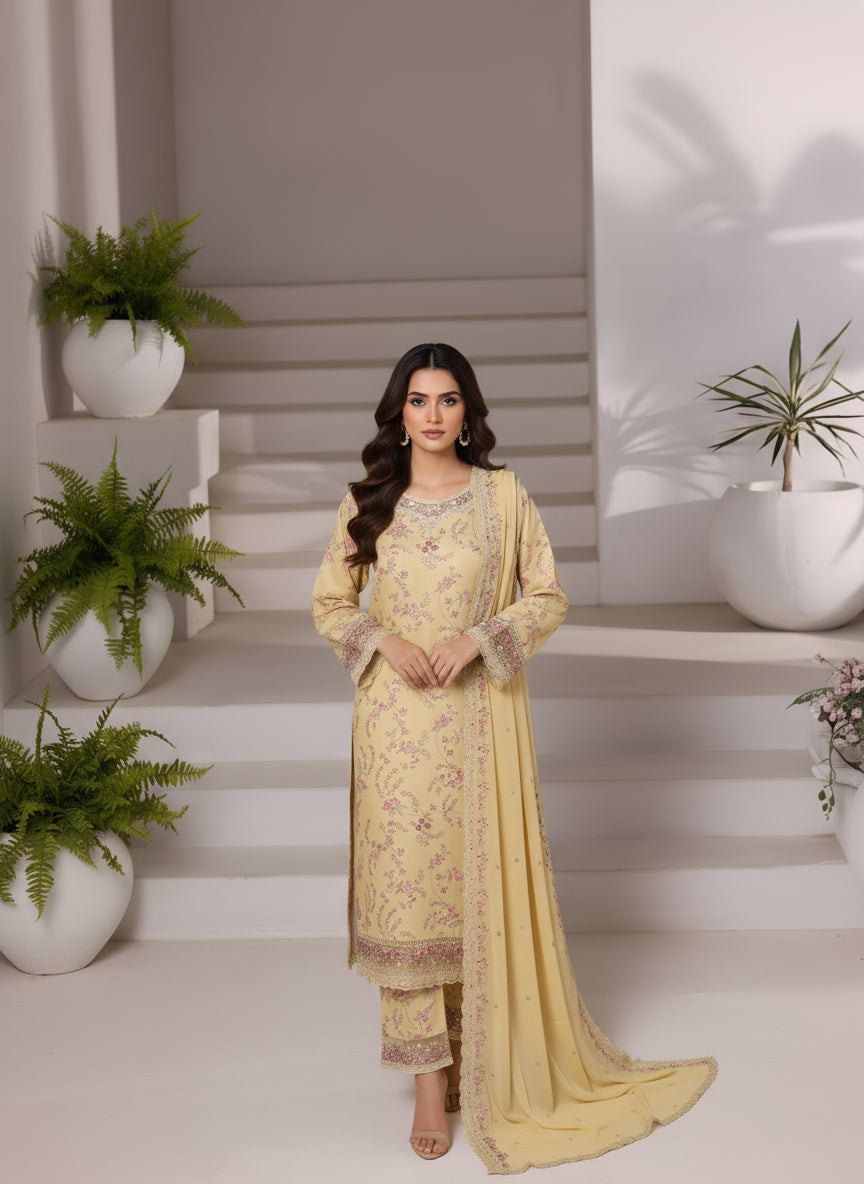 Elegant 3-piece viscose suit featuring a soft, breathable fabric paired with an embroidered chiffon dupatta — perfect for festive and semi-formal occasions.