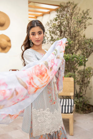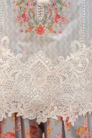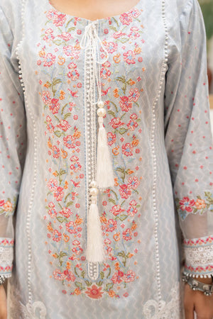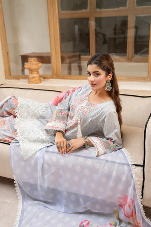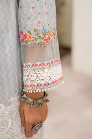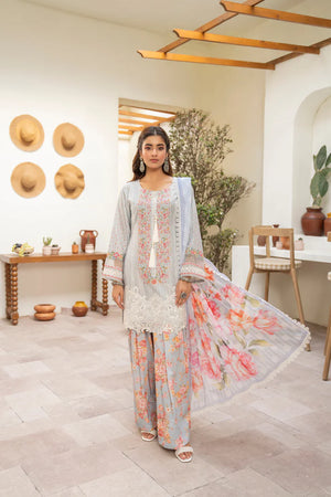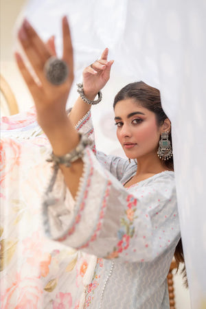 Discover the perfect look. Its intriguing details make it a must-have for any wardrobe. Designed for comfort and style, you'll feel confident and fashionable every time you wear it. Upgrade your look today with this outfit. This upcoming 3PC ensemble features a short shirt with a cross stitch neckline and organza patchwork on the borders and sleeves, paired with a printed crinkle chiffon dupatta finished with all-over lace, and a timeless farshi shalwar for a graceful silhouette.
