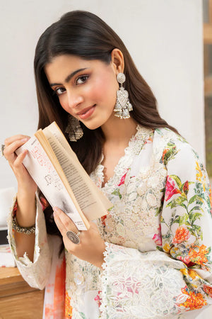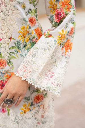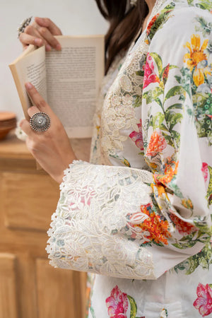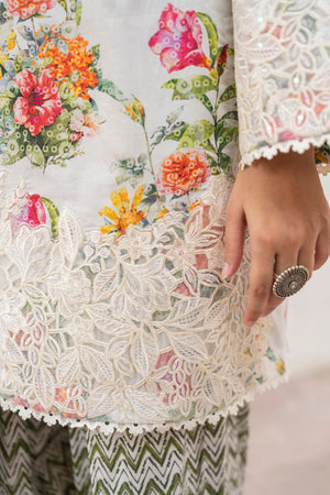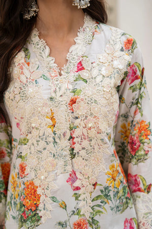 Discover the perfect look. Its intriguing details make it a must-have for any wardrobe. Designed for comfort and style, you'll feel confident and fashionable every time you wear it. Upgrade your look today with this outfit. A captivating 3PC ensemble featuring a short shirt adorned with multi embroidery, sequin work, and delicate 3D floral accents on the neckline. It’s paired with a printed chiffon dupatta finished with laces all around and a beautifully flowing farshi shalwar — perfect for festive charm and timeless elegance.