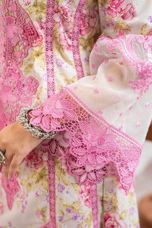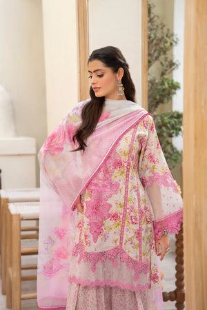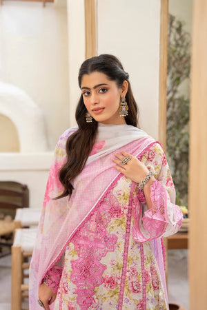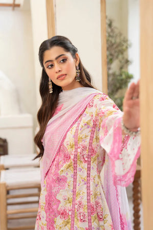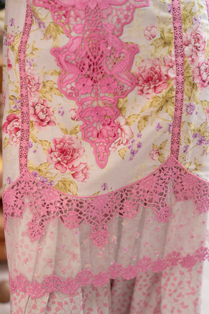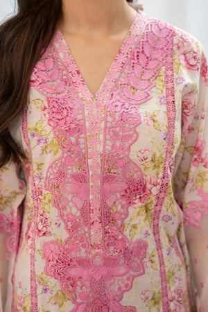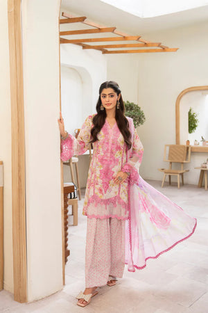 Discover the perfect look. Its intriguing details make it a must-have for any wardrobe. Designed for comfort and style, you'll feel confident and fashionable every time you wear it. Upgrade your look today with this outfit. This 3PC ready-to-wear set features a printed shirt with a dissolving neckline enhanced with thread work, finished with organza patch detailing on the border and sleeves. It’s paired with a printed chiffon apple silk dupatta and a coordinated printed shalwar for a complete and effortlessly chic look.