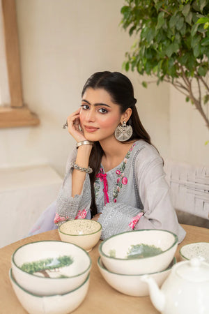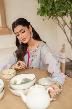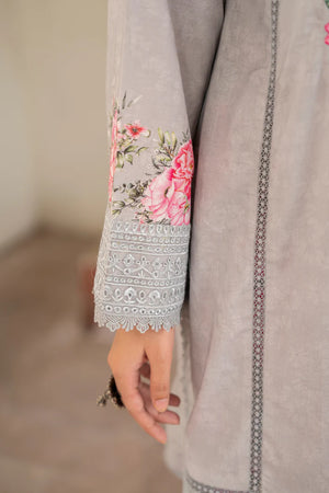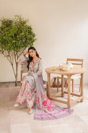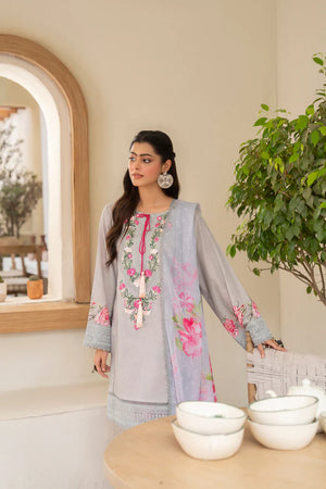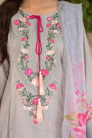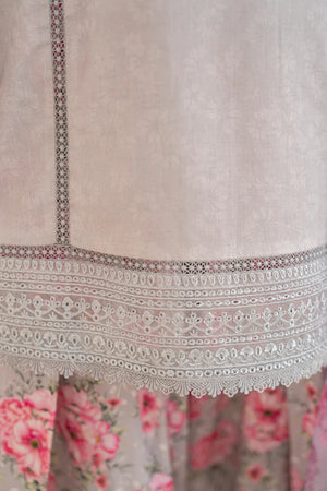 Discover the perfect look. Its intriguing details make it a must-have for any wardrobe. Designed for comfort and style, you'll feel confident and fashionable every time you wear it. Upgrade your look today with this outfit. This 3PC ready-to-wear set features a short shirt adorned with multi-thread embroidery on the neckline and pati, beautifully finished with lace work on the border. It is paired with a printed apple silk dupatta trimmed with laces all over, and a printed floral shalwar to bring out a fresh and festive flair.