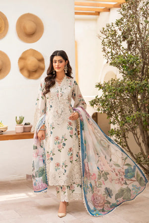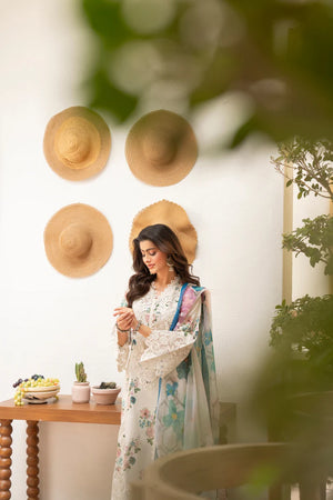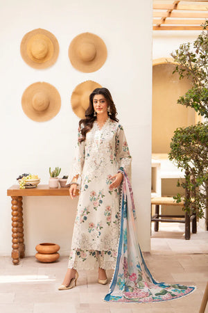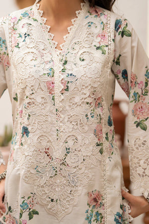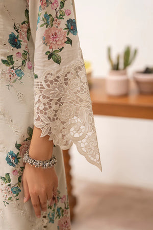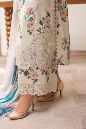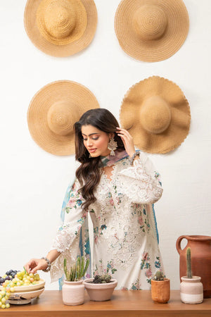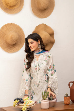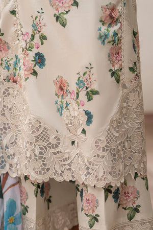 Discover the perfect look. Its intriguing details make it a must-have for any wardrobe. Designed for comfort and style, you'll feel confident and fashionable every time you wear it. Upgrade your look today with this outfit. This 3PC ready-to-wear ensemble showcases a long panel shirt featuring a laser-cut neckline and matching border, paired with a printed chiffon dupatta trimmed with lace all over, and a printed trouser finished with a stylish patch—ideal for festive elegance with modern flair.