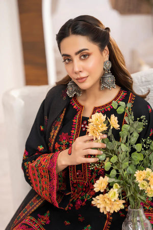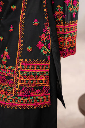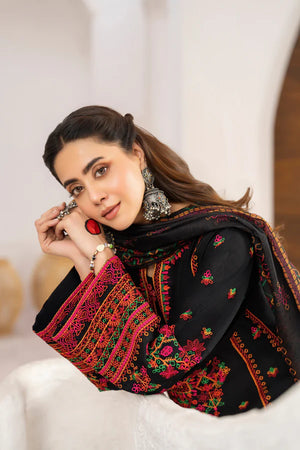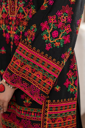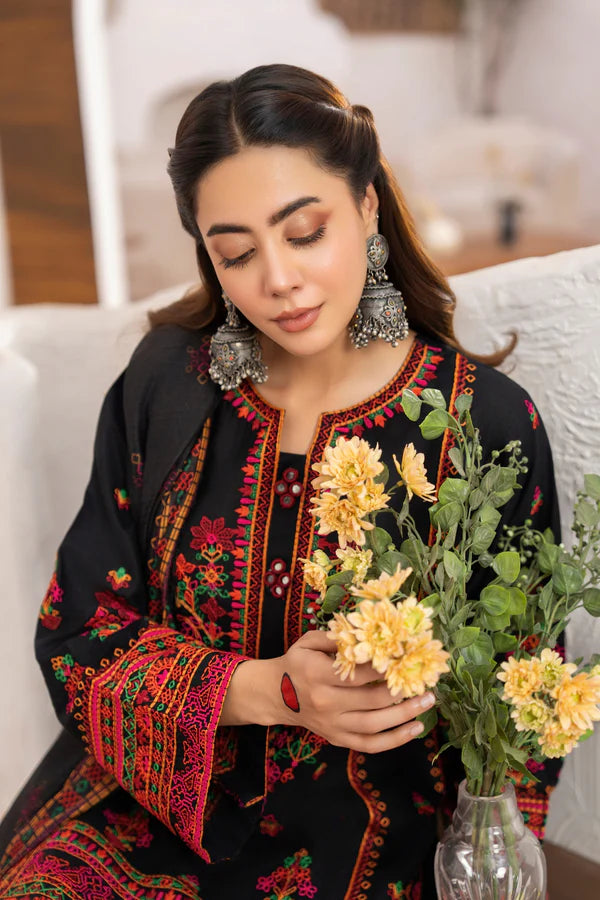 Charcoal Luxe is a sleek twist on navy, featuring matte Kashmiri thread work and mirror detailing at the neckline. A digital-printed Monark dupatta with shuttle lace drapes like inked silk, while a Farshi shalwar edged in embroidered patti brings sculpted movement. Perfect for modern soirées where black-tie meets tradition.