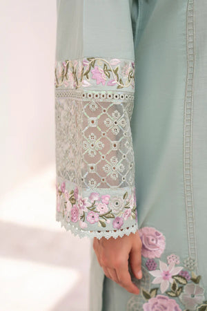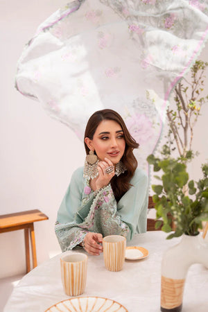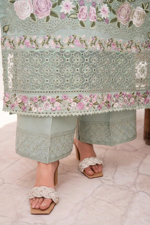 Mint Green is a breath of fresh summer air—Chikankari embroidery in soft green threads covers a long cotton shirt. A printed chiffon dupatta edged in lace flutters like a cool breeze, while loose trousers with a tasteful embroidered patch round out the look. Wear it when you crave quiet charm with a modern twist.