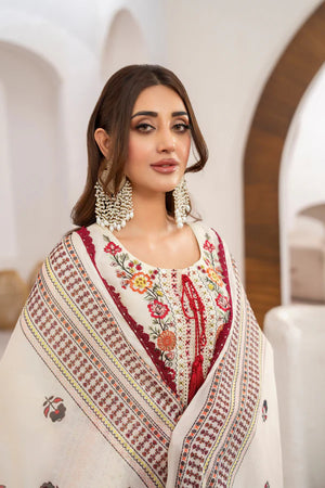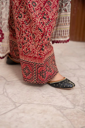 Vanilla Dust marries creamy neutrals with multi-thread, panni, and Chikankari work, while loops at the sleeves add a playful finish. A pure silk printed dupatta trimmed in lace drapes like morning light, and a Farshi shalwar with hand-block printing completes the artisanal charm. Perfect for cultural brunches under soft sun.