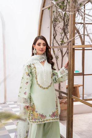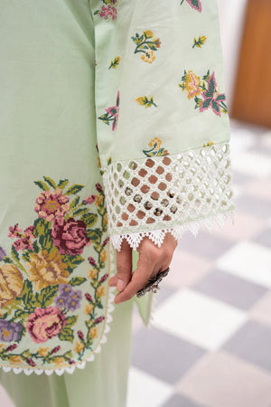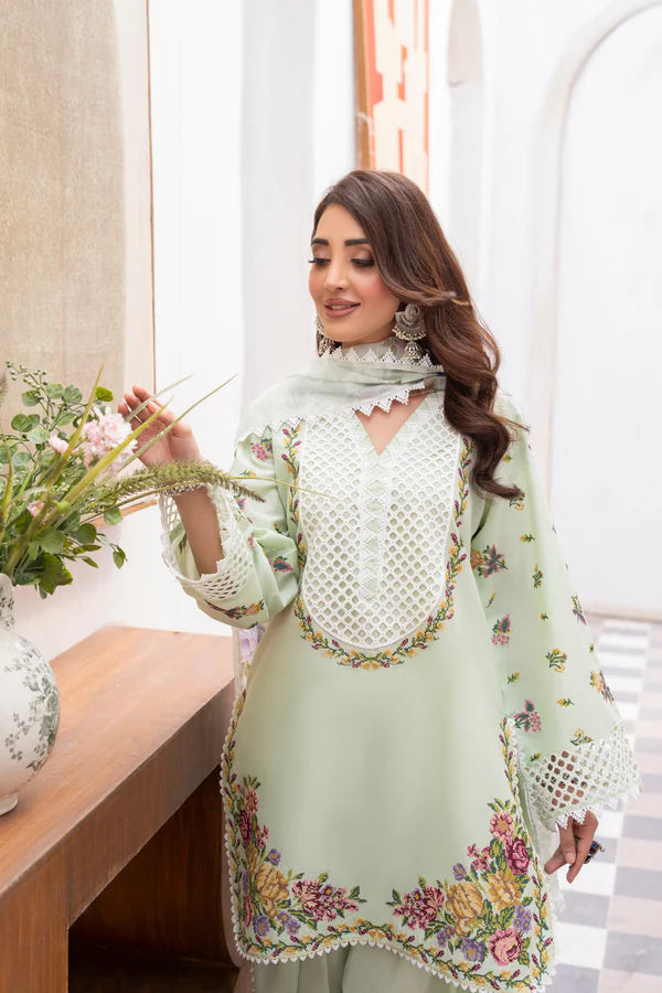 Pistachio Glow is a fresh twist on tradition with a short shirt featuring cross-stitch embroidery, a rounded border, and 3D lace at the neckline. A digital-printed Monark dupatta trimmed in milky lace floats like a summer breeze, while a Farshi shalwar—beautifully embroidered—grounds the look in effortless charm. Wear it when you want cool, contemporary flair.