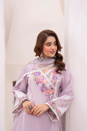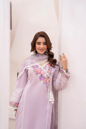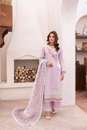Moonlit Purple envelopes you in a regal lilac tone, its Angrakha shirt detailed with Chikankari, multicolor embroidery, and tasseled dori. A digital-printed Khaadi Net dupatta, finished in milky lace, floats like twilight clouds. Loose trousers with a matching embroidered patch ground the look, perfect for evening festivities under soft lights.