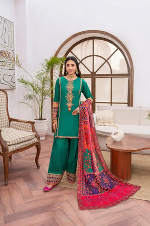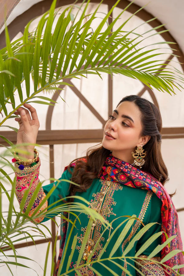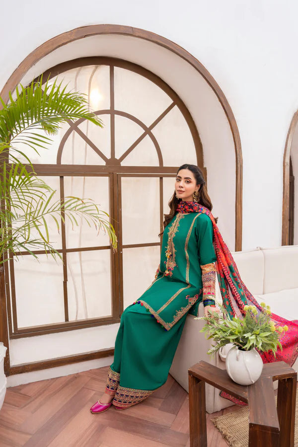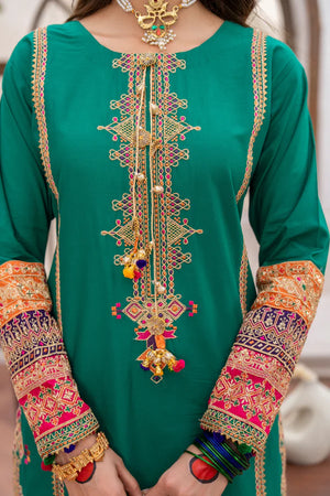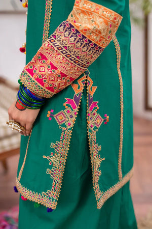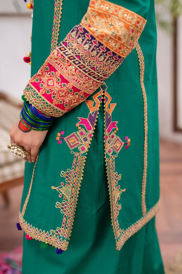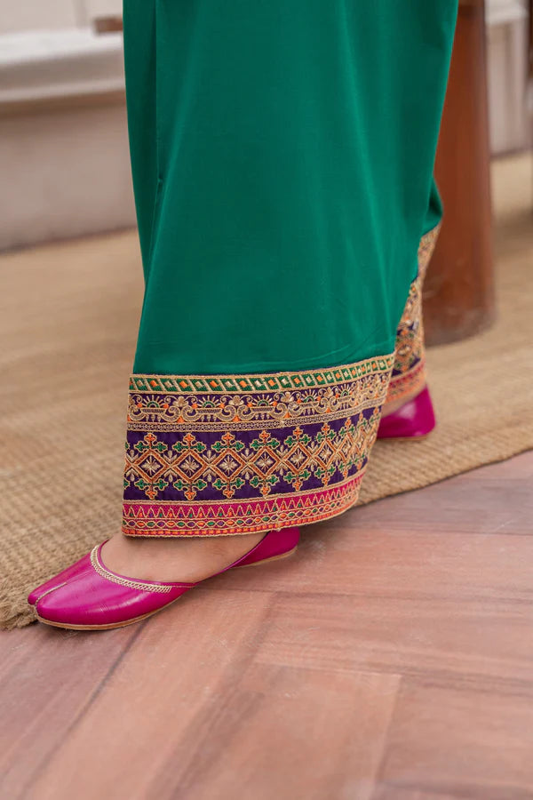 Bottle Green grounds you in deep forest tones with multi embroidery, dori, and gotta work across front and back, plus patch accents on the sleeves. A pure silk printed traditional dupatta draped in gotta lace adds a luxe finish, while a Farshi shalwar with embroidery completes the rich tapestry. Wear it to command the room in refined style.