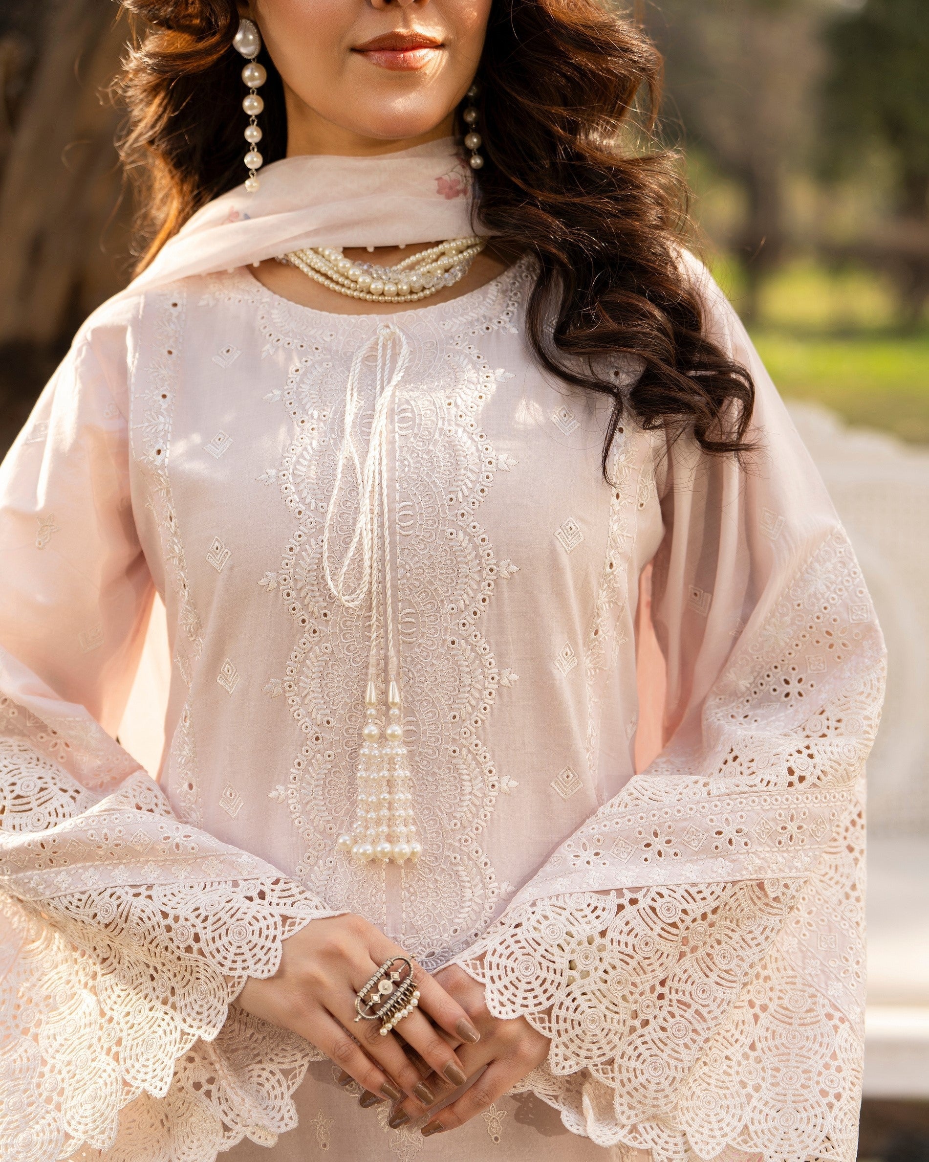 Cutline: Long Shirt + Dupatta + Trouser Shirt: Embroidered long shirt featuring cutwork and Kaviya patches on the border and neckline, enhanced with a beaded string detail and finished with milky lace along the border for an elegant handcrafted touch.