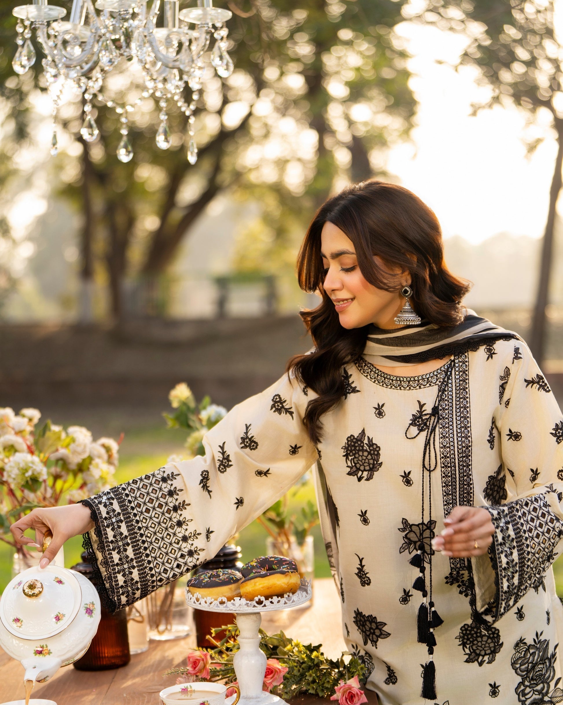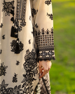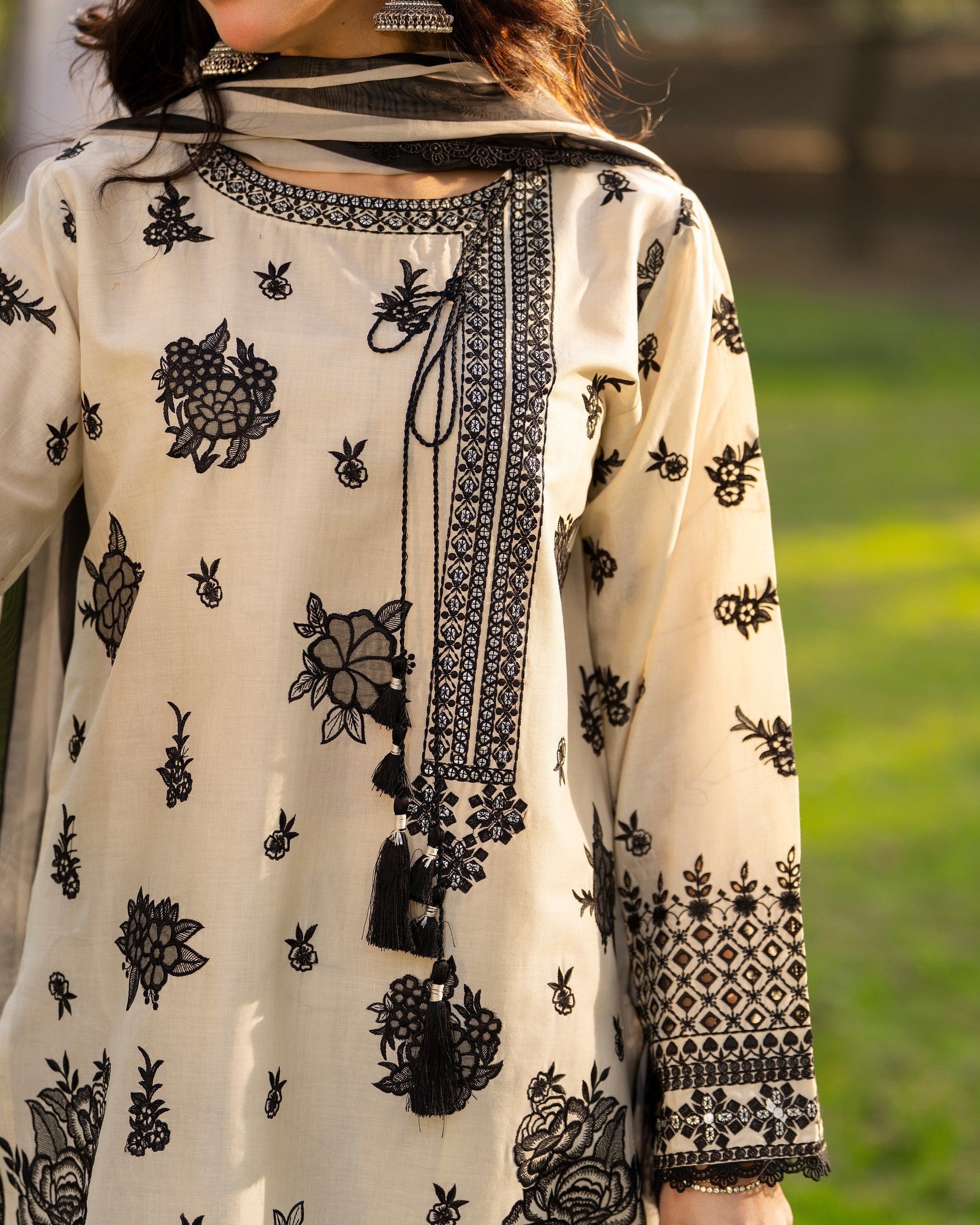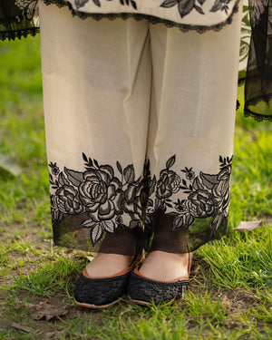 Shirt: Long cotton shirt enhanced with multi-thread embroidery, featuring milky lace on the neckline and a cutwork patch along the border for a subtle handcrafted finish.