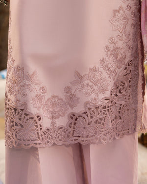 Shirt: Long cotton shirt enhanced with multi-thread embroidery, featuring milky lace on the neckline and a cutwork patch along the border for a subtle handcrafted finish.