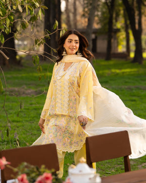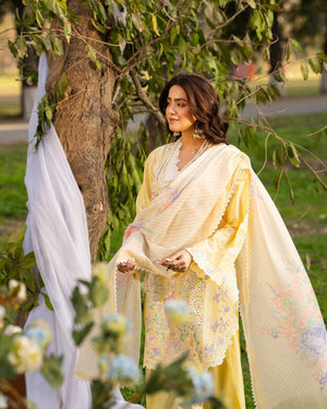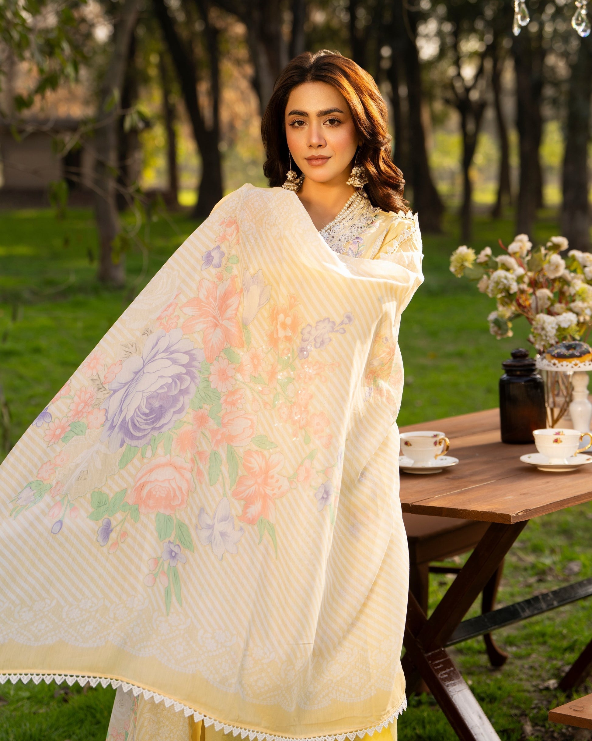 Dupatta: Printed lawn dupatta framed with all-around milky lace, adding softness and a classic feminine touch.