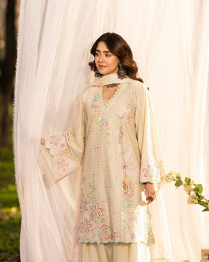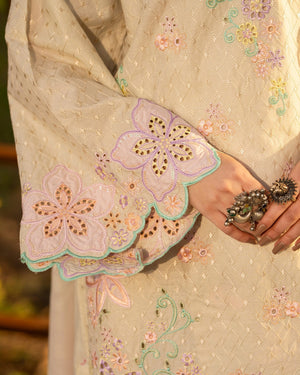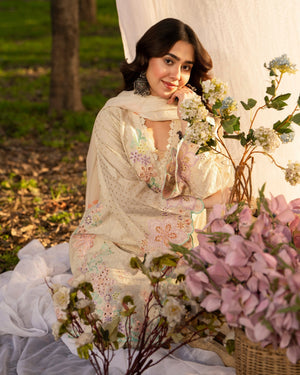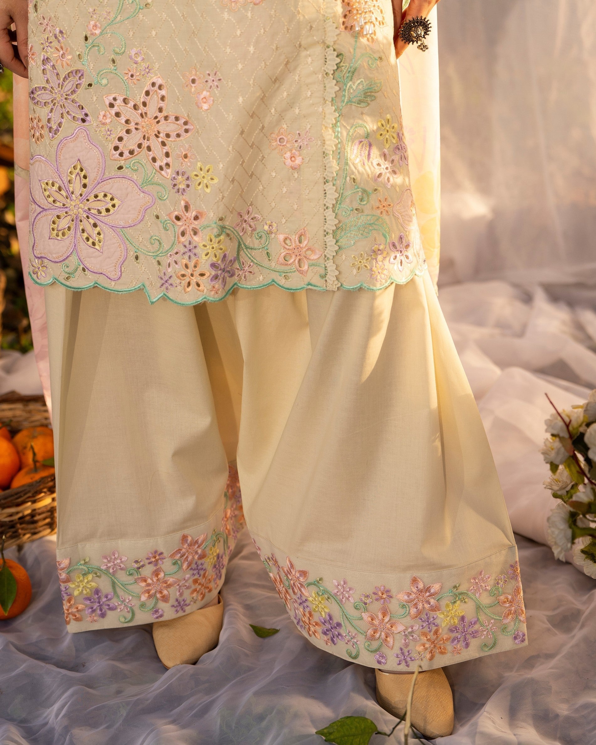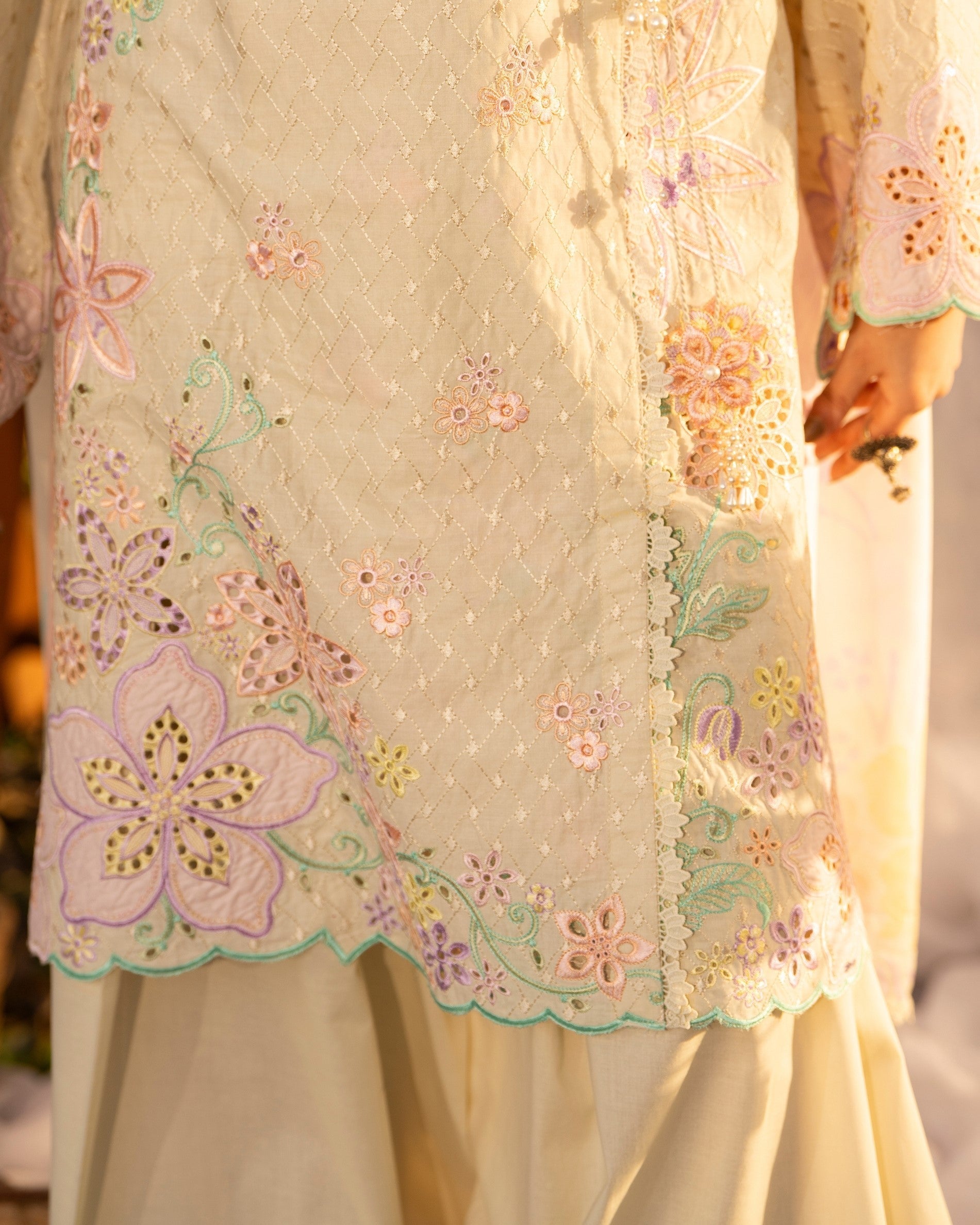 Dupatta: Printed silk dupatta finished with all-around milky lace, adding softness and a luxurious drape.