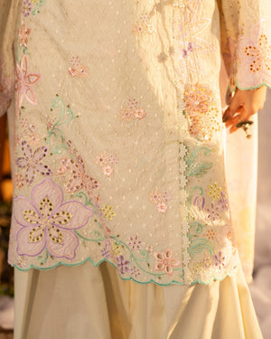 Shirt: Short boring chikankari angrakha shirt adorned with delicate applique and silk embroidery, creating a graceful fusion of tradition and craftsmanship.