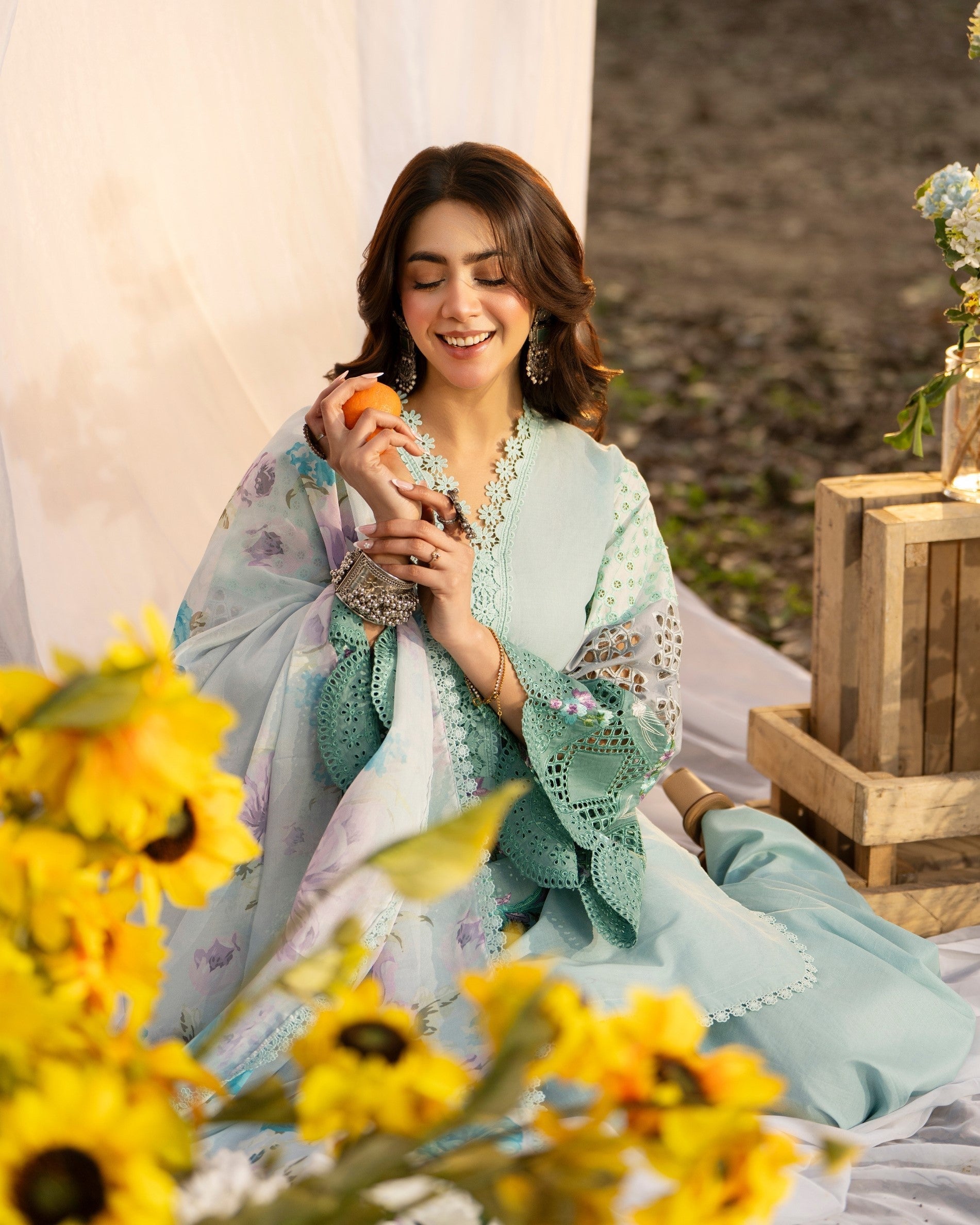 A refined blend of contemporary charm and intricate detailing. Designed to stand out with delicate embroidery and graceful accents, this ensemble offers a perfectly balanced look for festive and elegant daytime wear.