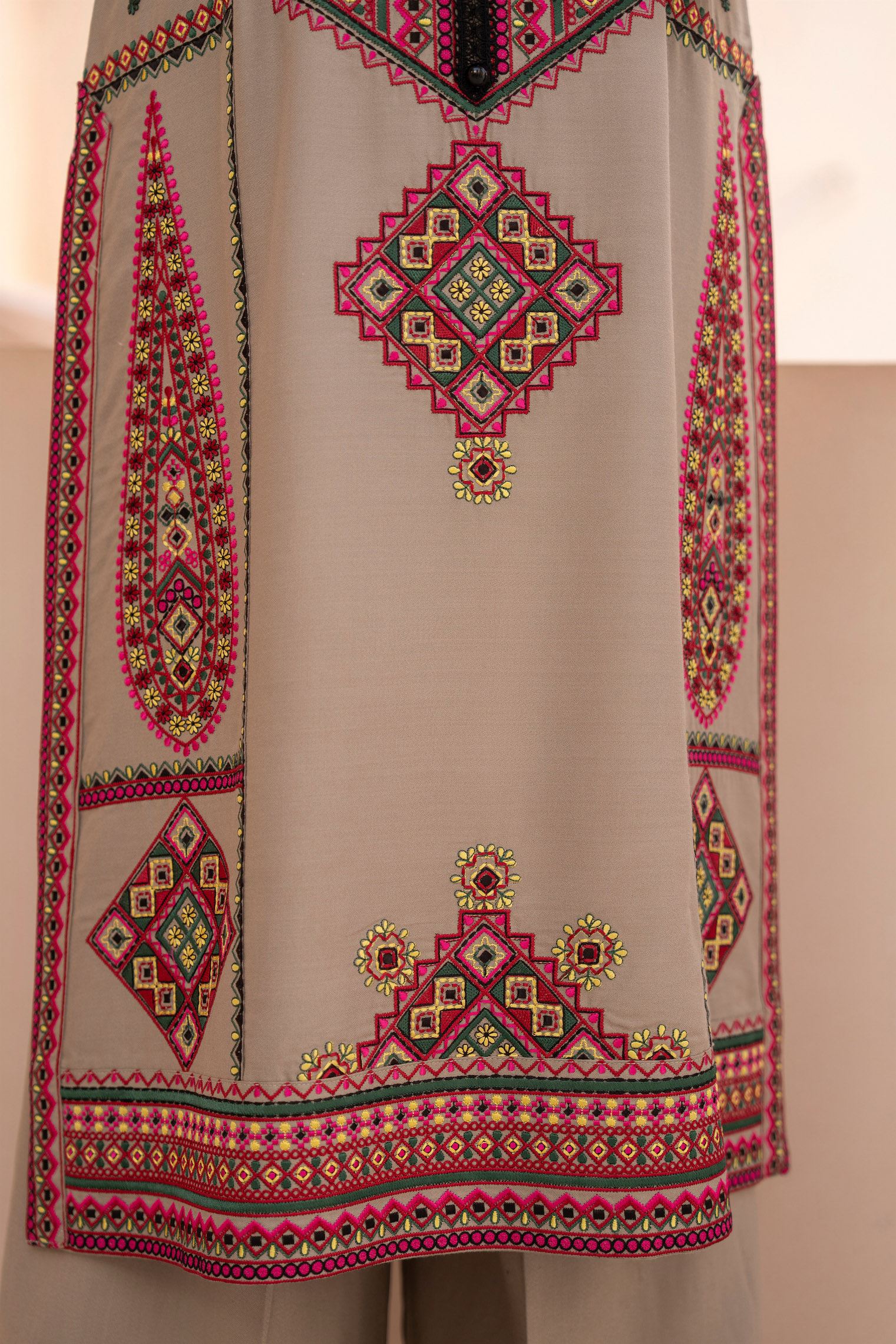 Shirt: Long shirt adorned with multi-thread embroidery and finished with buttons on the neckline for a clean, classic touch.