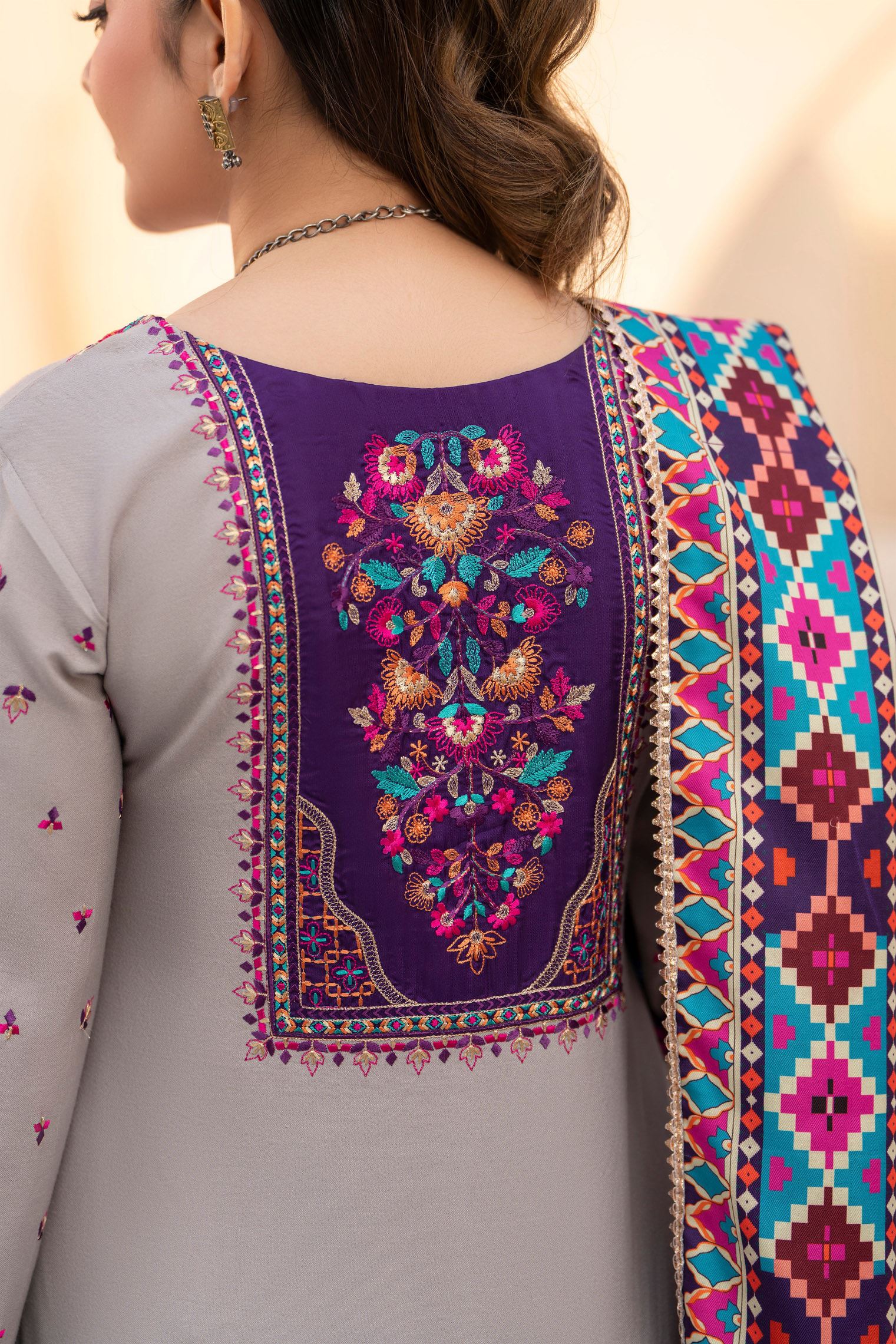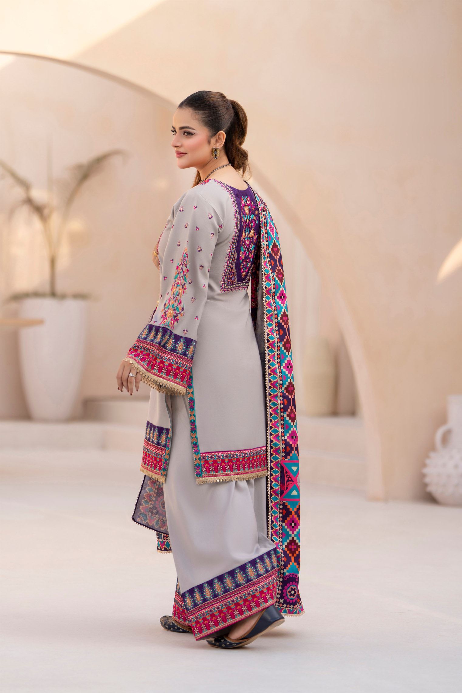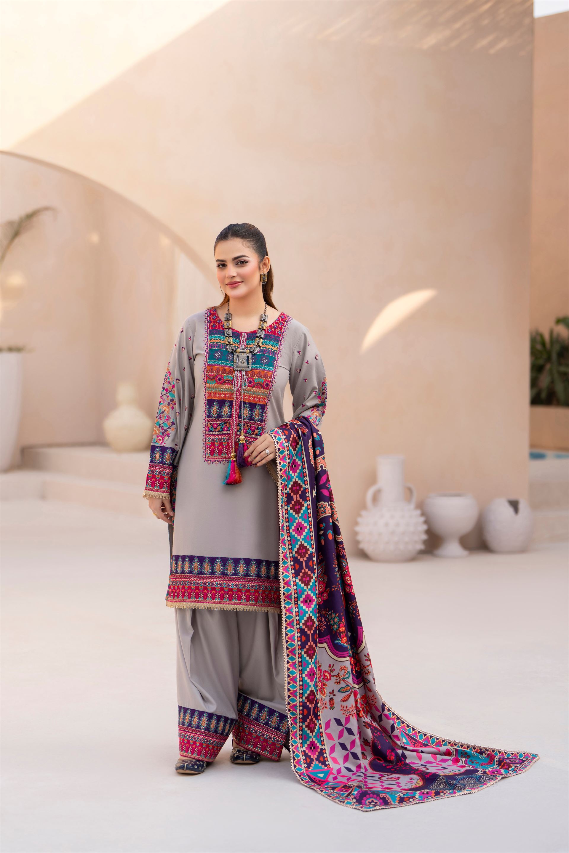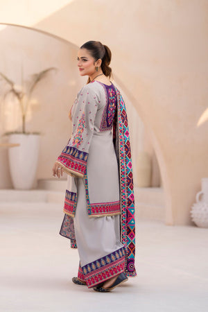 Discover the perfect look. Its soft Dhanak feel, elegant thread embroidery, and refined detailing make it an ideal winter outfit for casual gatherings, dawat wear, and everyday comfort. Designed for ease and style, it brings a polished charm to your wardrobe.