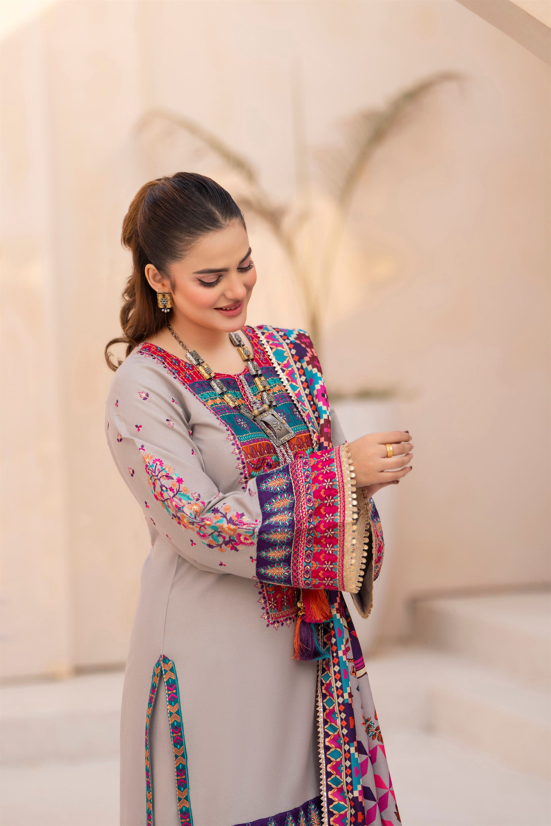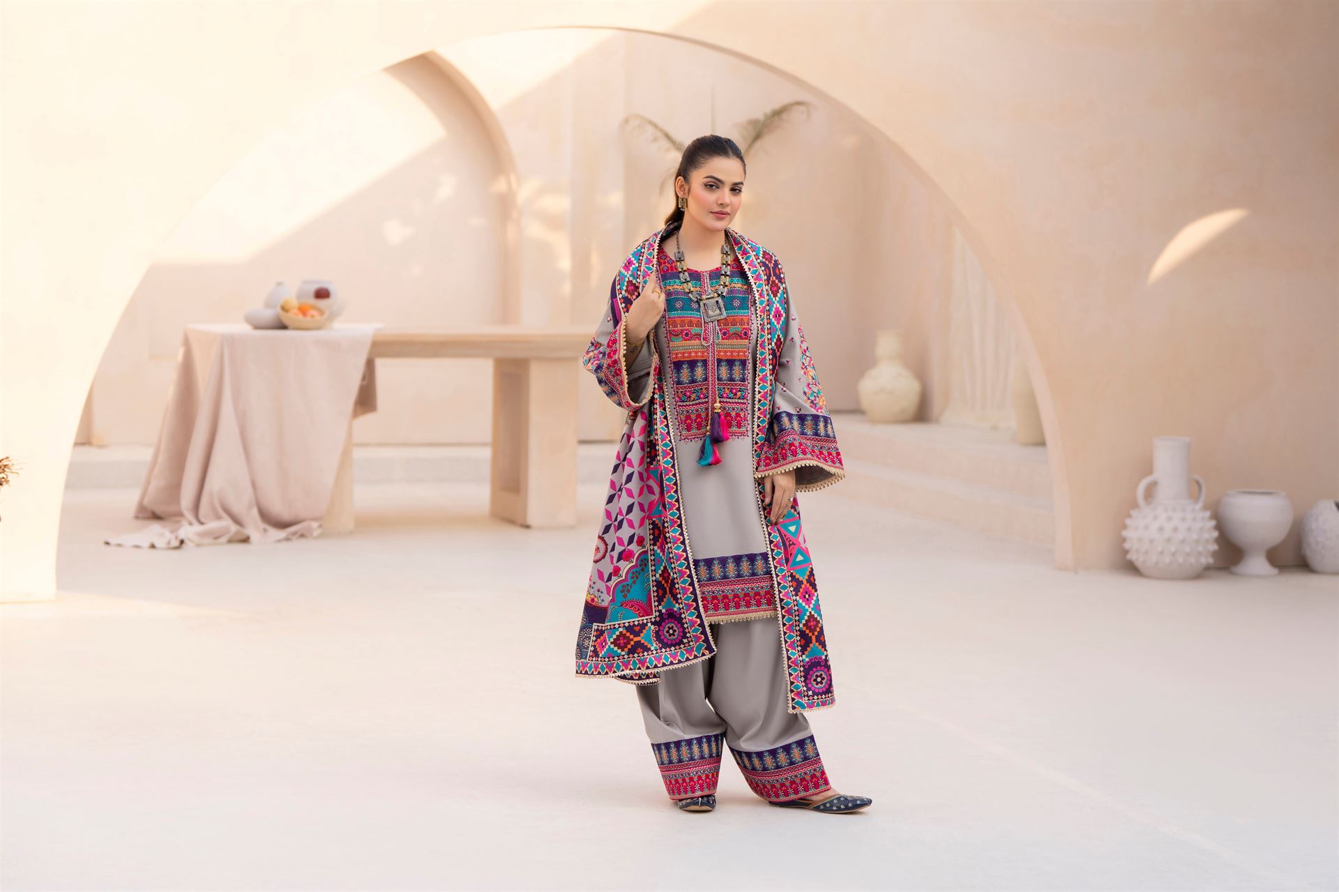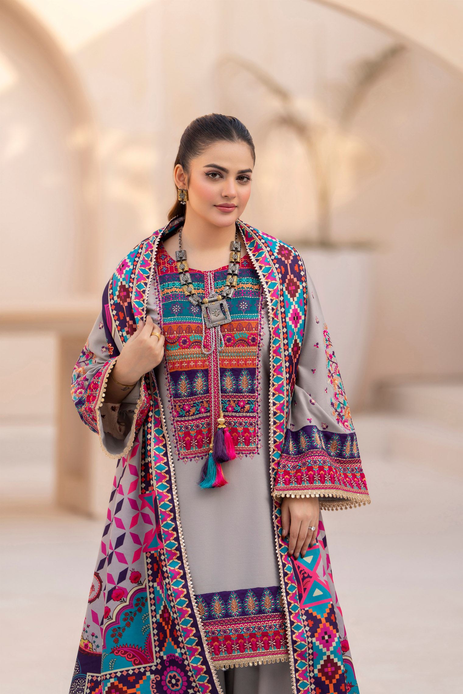 Discover the perfect look. Its soft Dhanak feel, elegant thread embroidery, and refined detailing make it an ideal winter outfit for casual gatherings, dawat wear, and everyday comfort. Designed for ease and style, it brings a polished charm to your wardrobe.