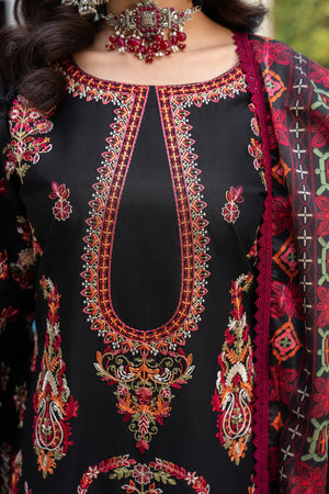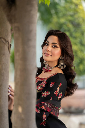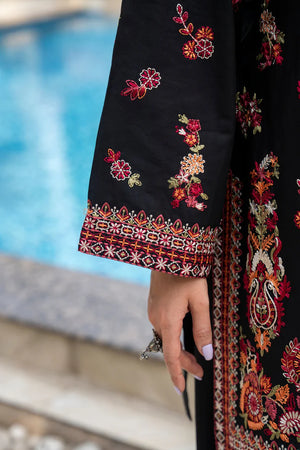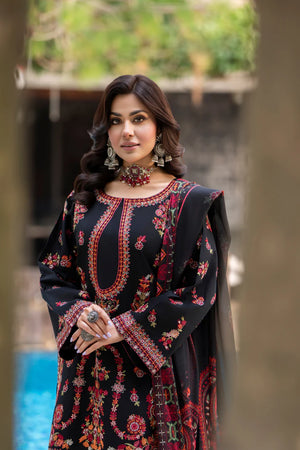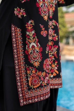 This elegant 3PC ready-to-wear ensemble in Deep Black features a short shirt adorned with fully multi Chikankari Kashmiri embroidery, lending it a timeless, artisanal flair. The coordinating pure apple silk dupatta is finished with an all-over shuttle lace border, adding luxurious texture and movement. Completing the look are Farshi shalwar trousers with an elasticized waistband and an embroidered patch detail, blending traditional appeal with modern comfort.
