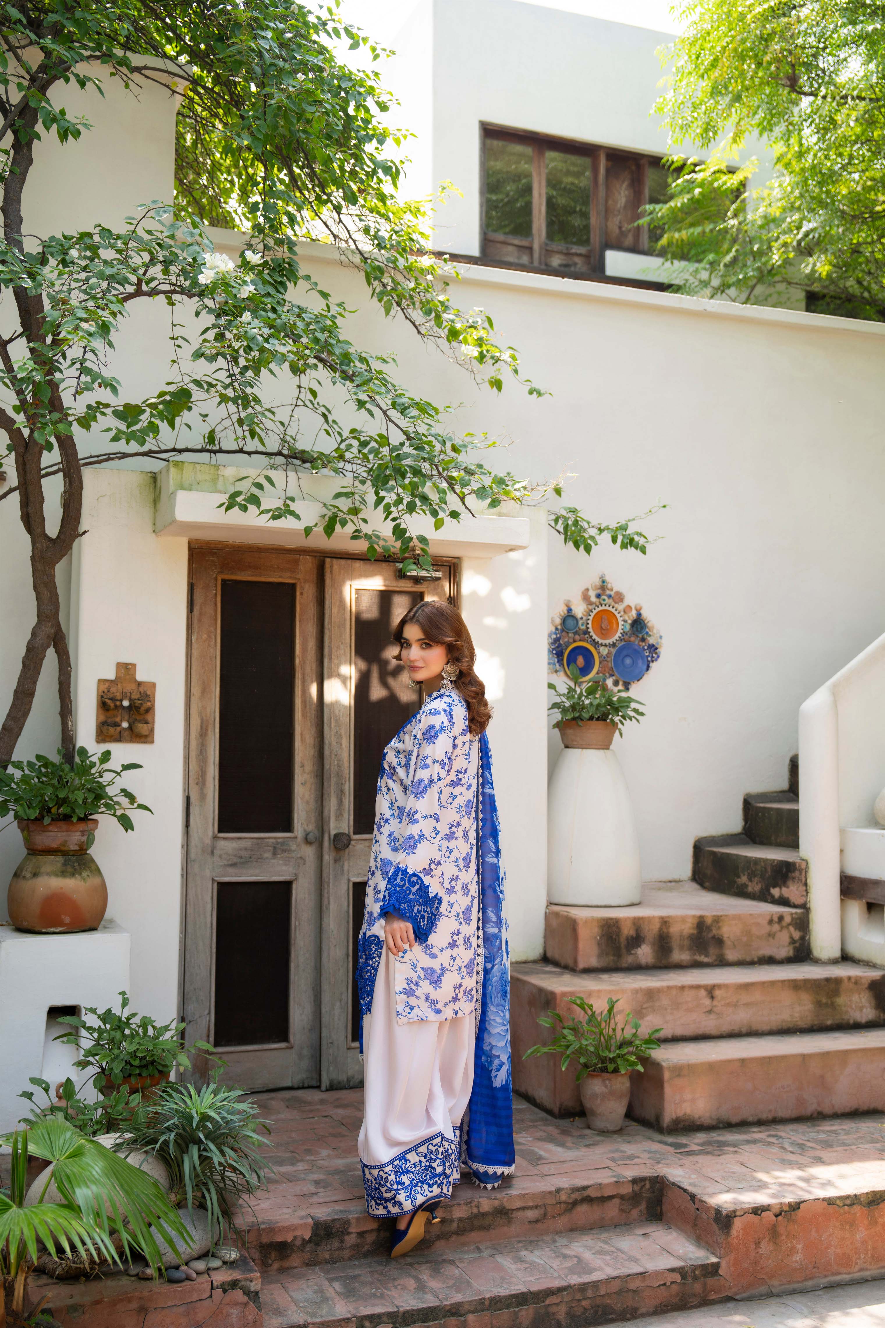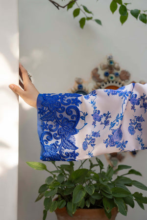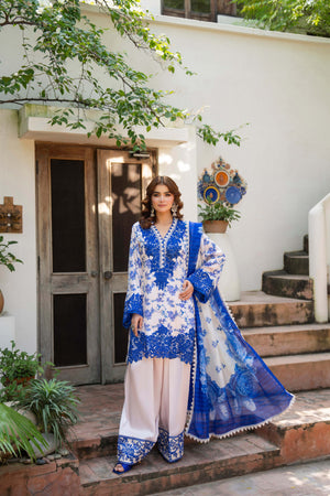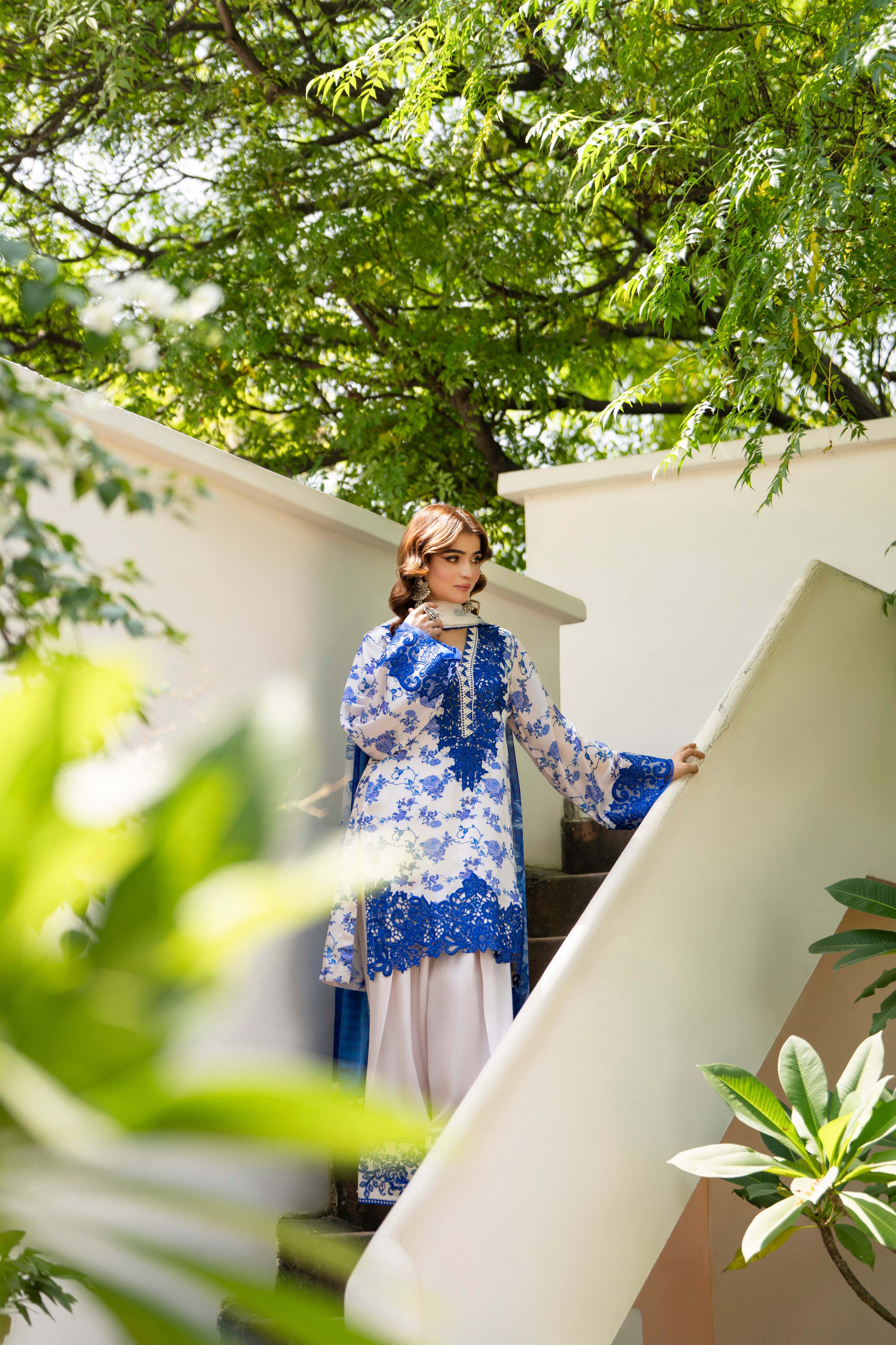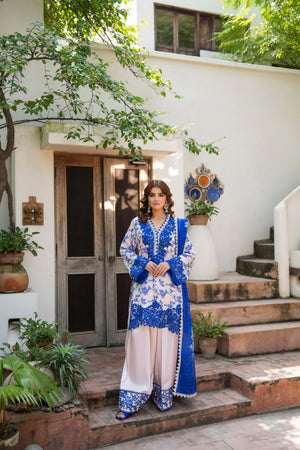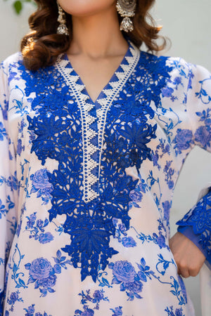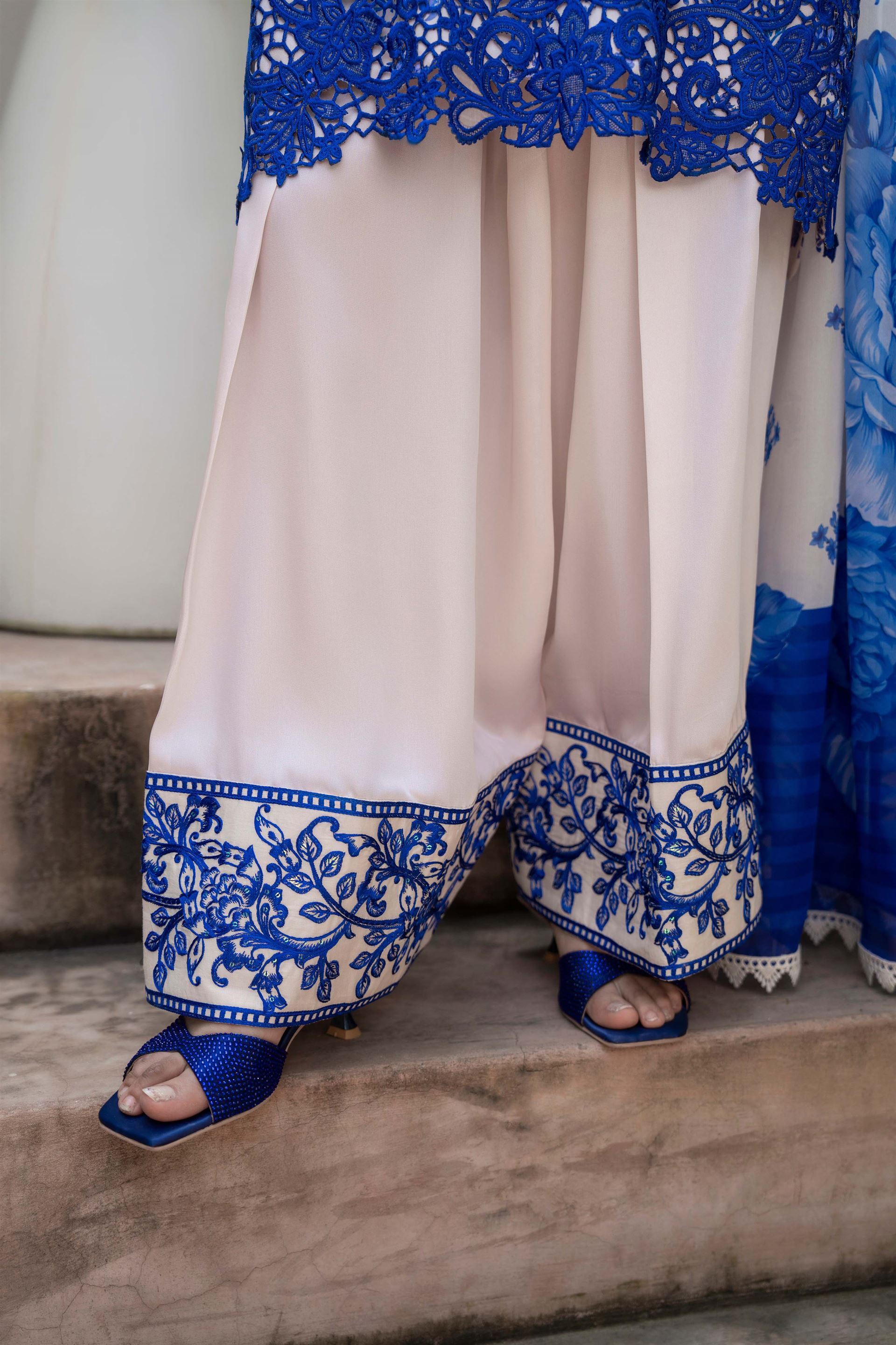 Unveil elegance with Celestial Grace, a breathtaking ensemble made from premium Shamoz Silk. The short shirt features a blue print beautifully highlighted with blue cutwork and 3D floral embroidery, adding a refined charm. It is paired with a farshi shalwar adorned with patchwork that enhances its traditional grace, while the printed silk dupatta finished with delicate lace detailing completes the look with timeless sophistication.