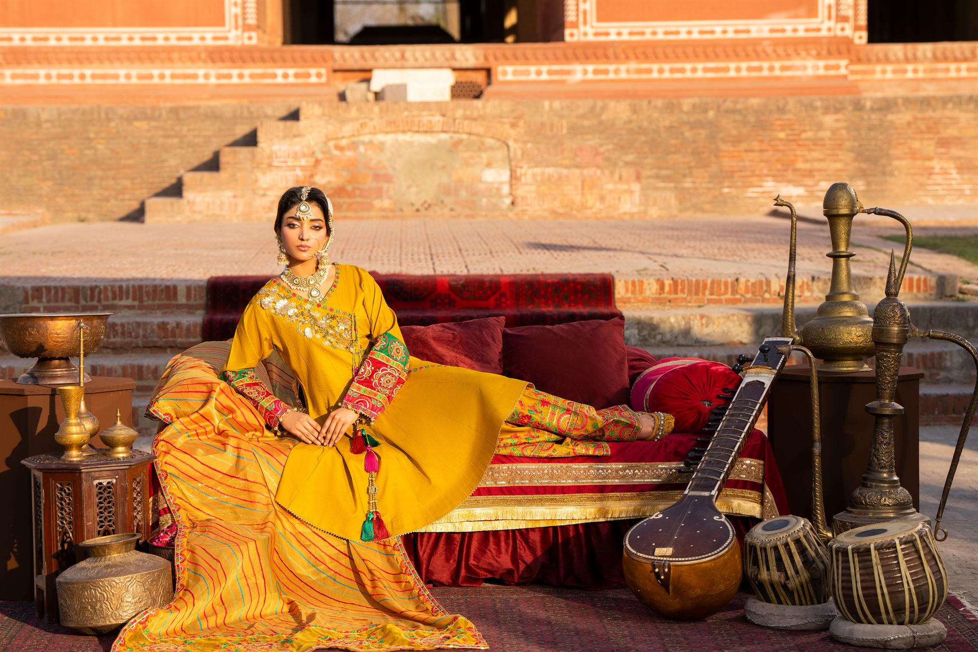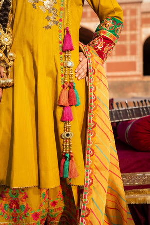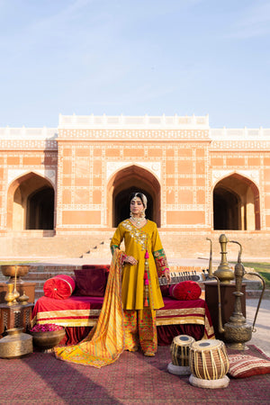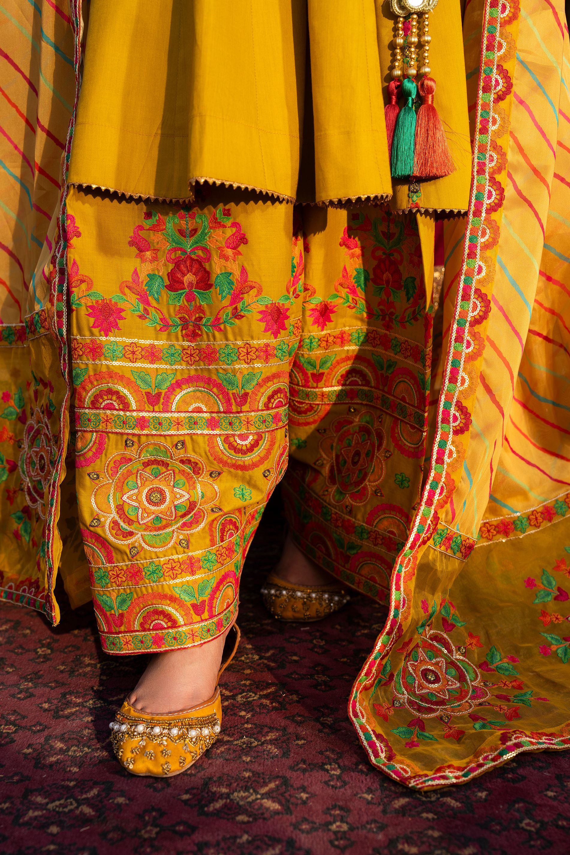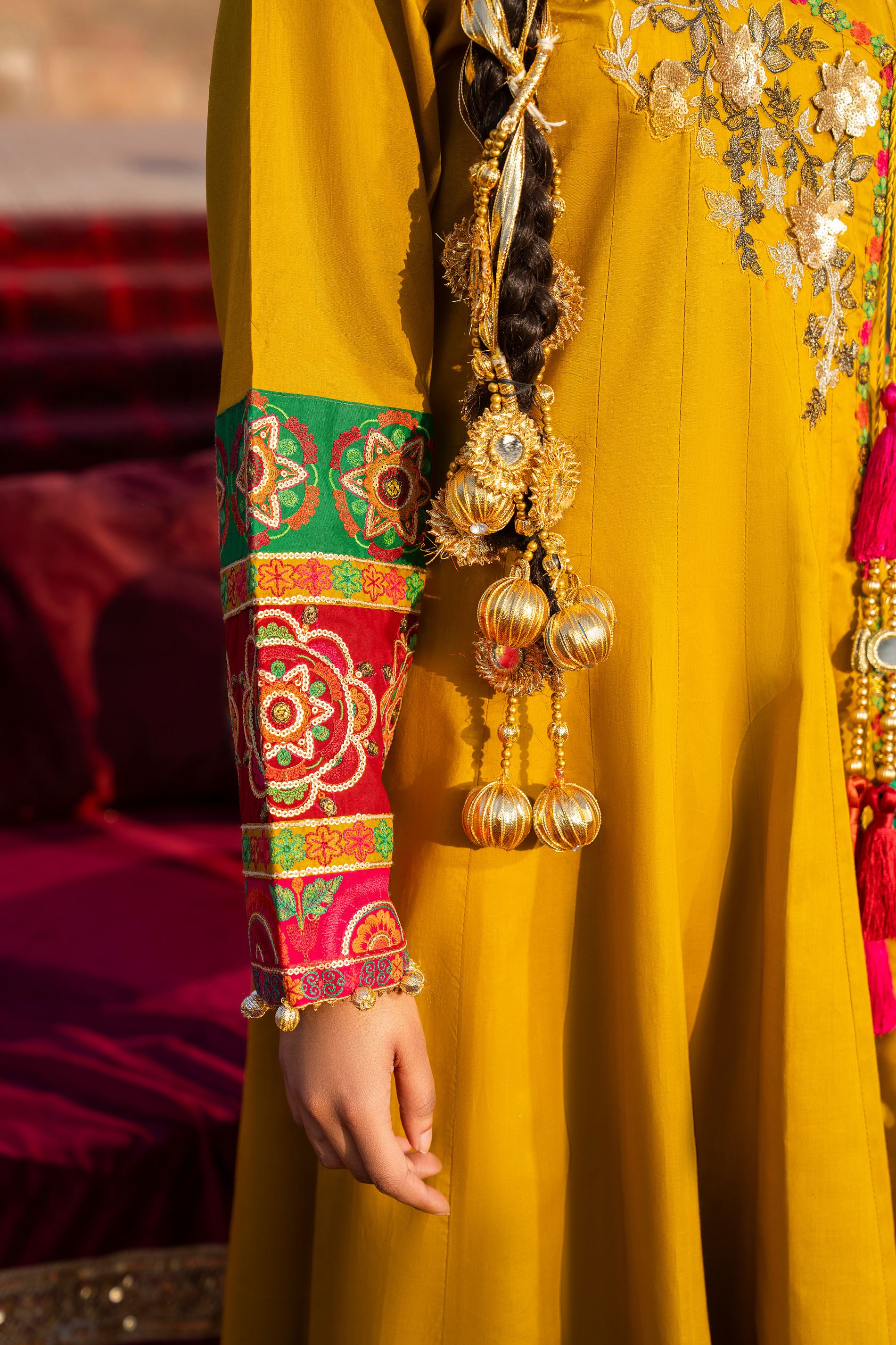 Angrakha Panel Frock with Matte Thread Work Embroidery and Multi Embroidered Patches on Sleeves, Featuring 3D Flowers on the Neckline.