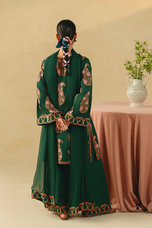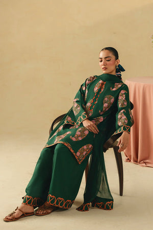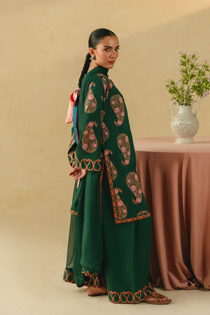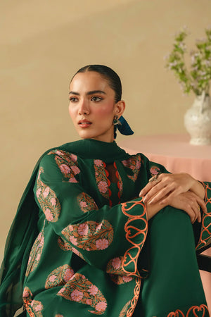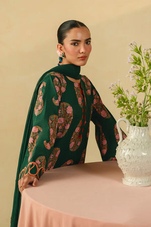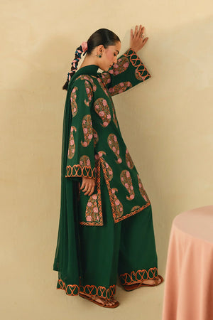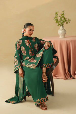 • A sophisticated three-piece bottle green ensemble featuring a screen-printed shirt adorned with intricate embroidery on the sleeves and hem. Paired with a farshi shalwar embellished with delicate threadwork and a coordinating chiffon embroidered dupatta, this outfit offers a harmonious and refined look.
