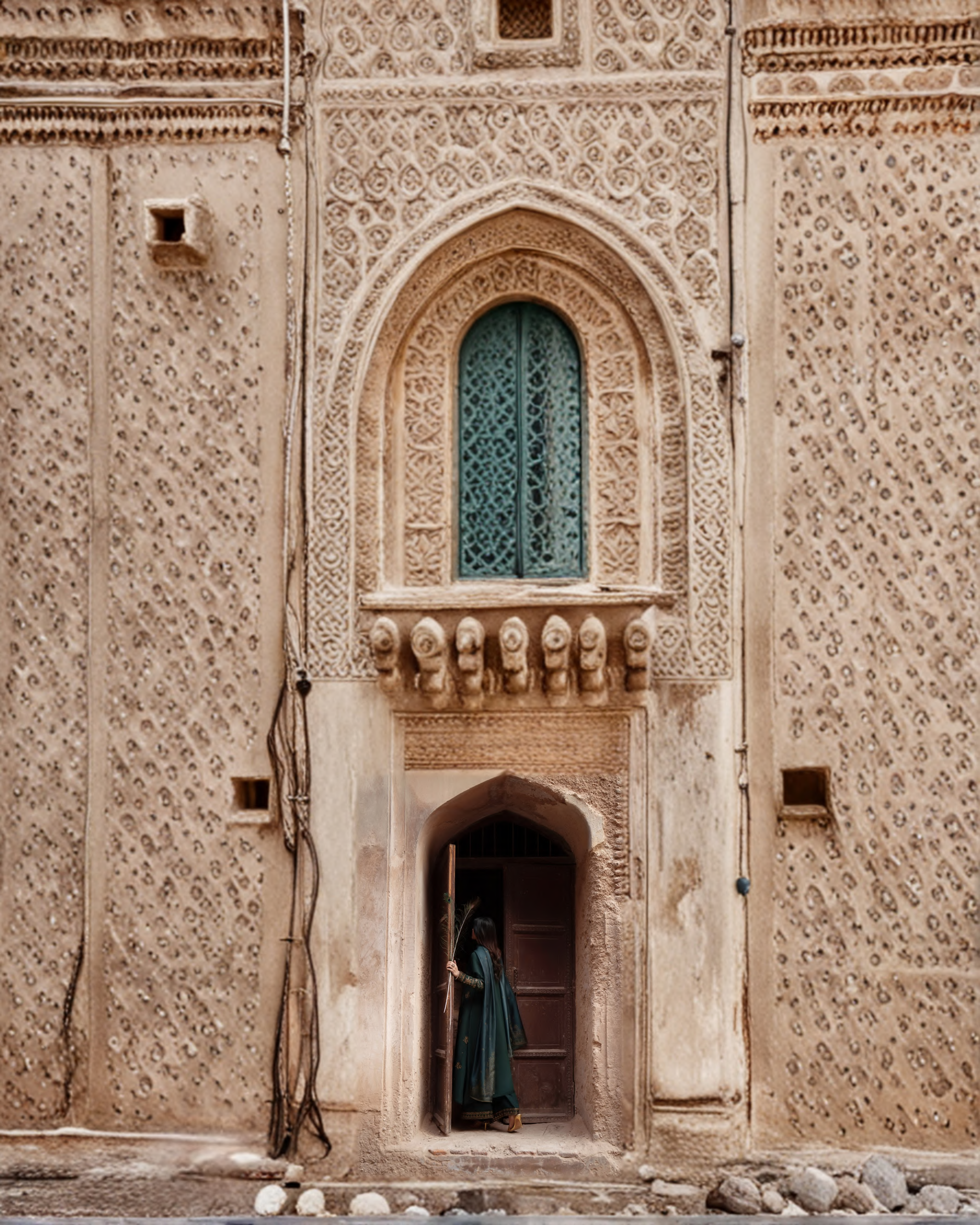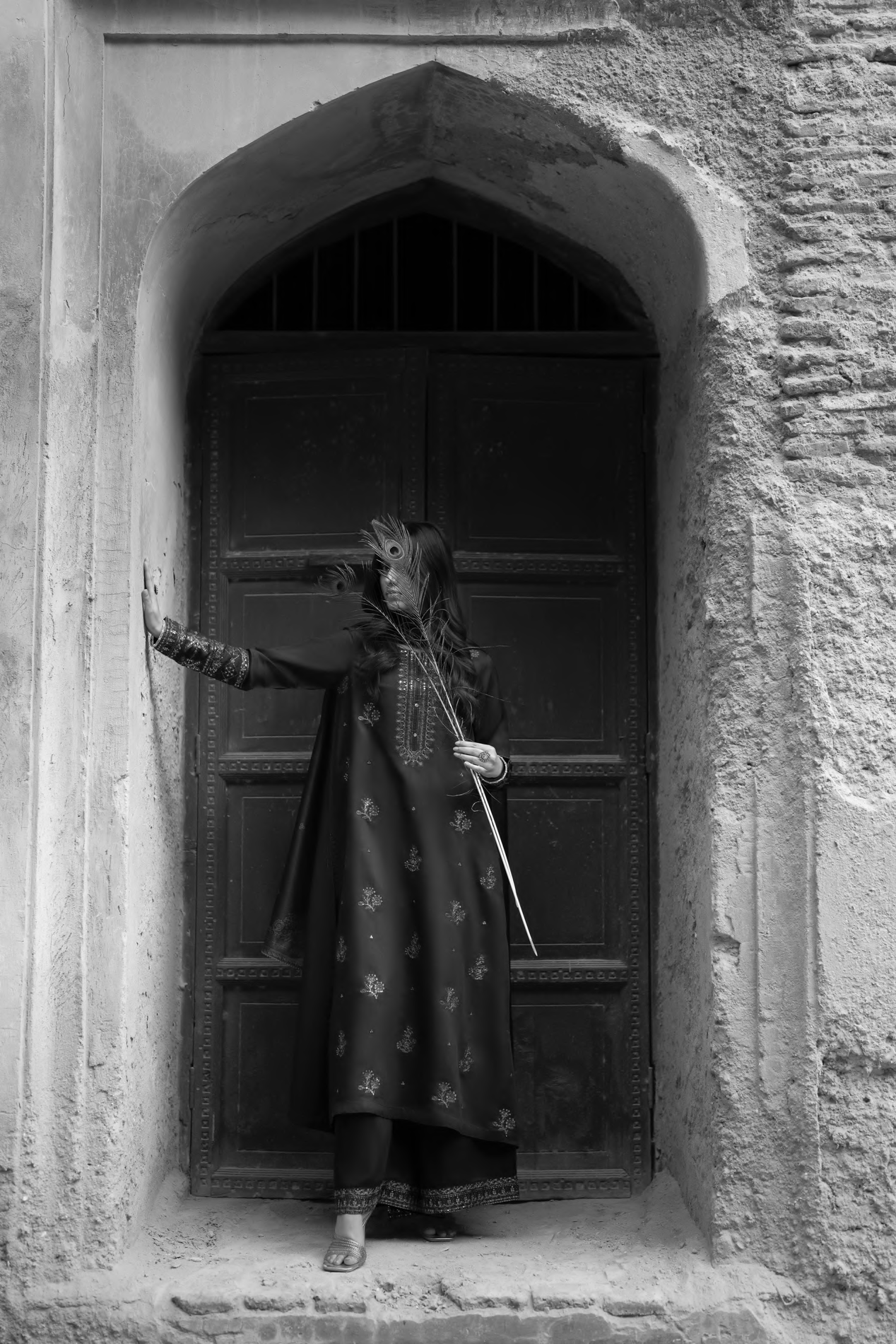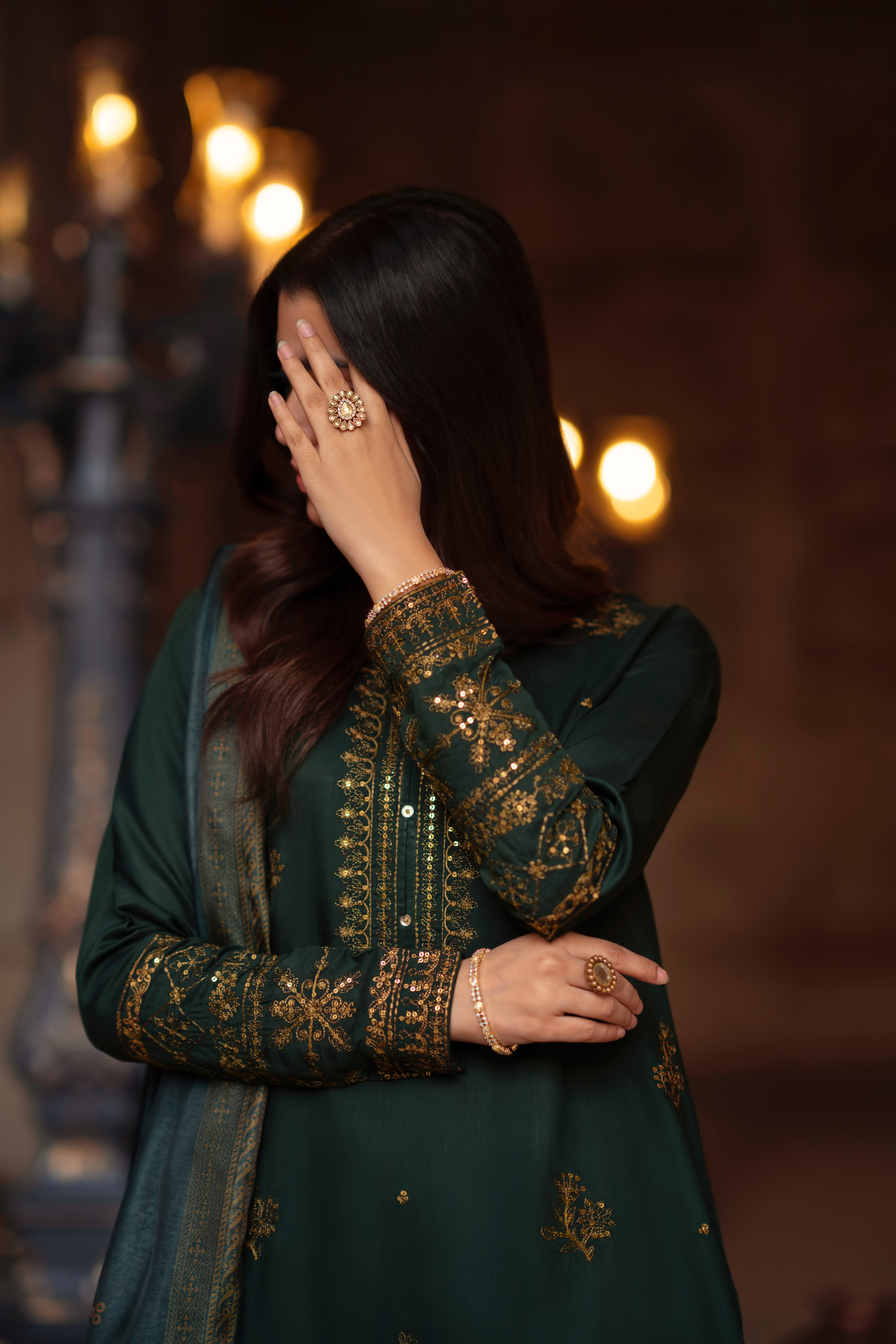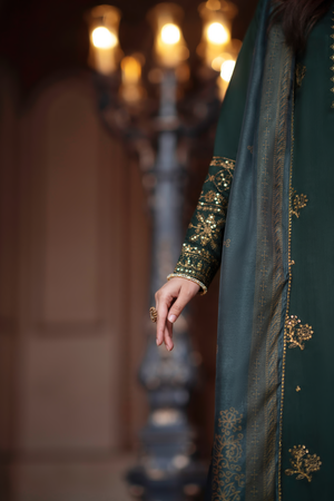 Crafted on a deep emerald green canvas and adorned with delicate gold embellishments, the kurta features intricate embroidery along the neckline and sleeves. Scattered heritage motifs further enhance the design, adding depth and refined elegance to the silhouette.