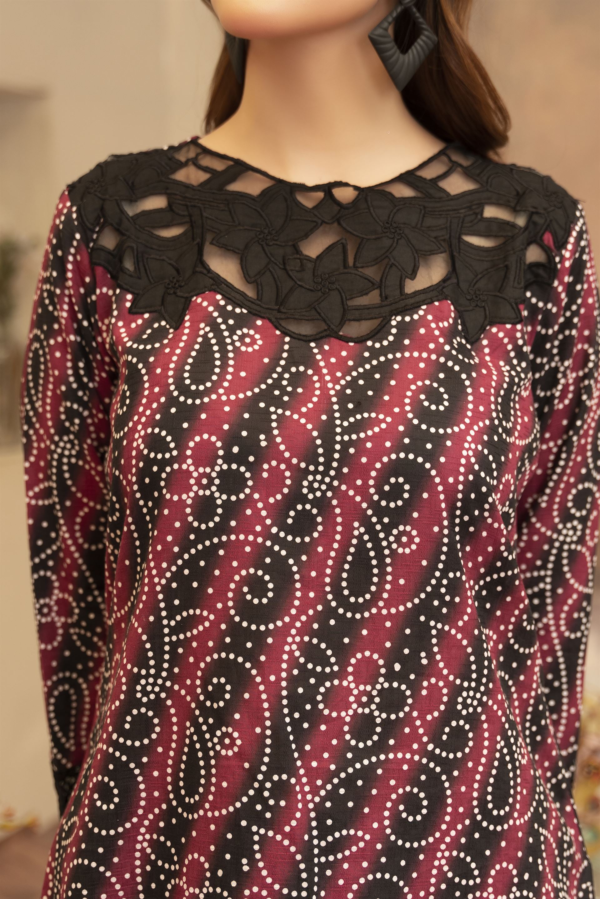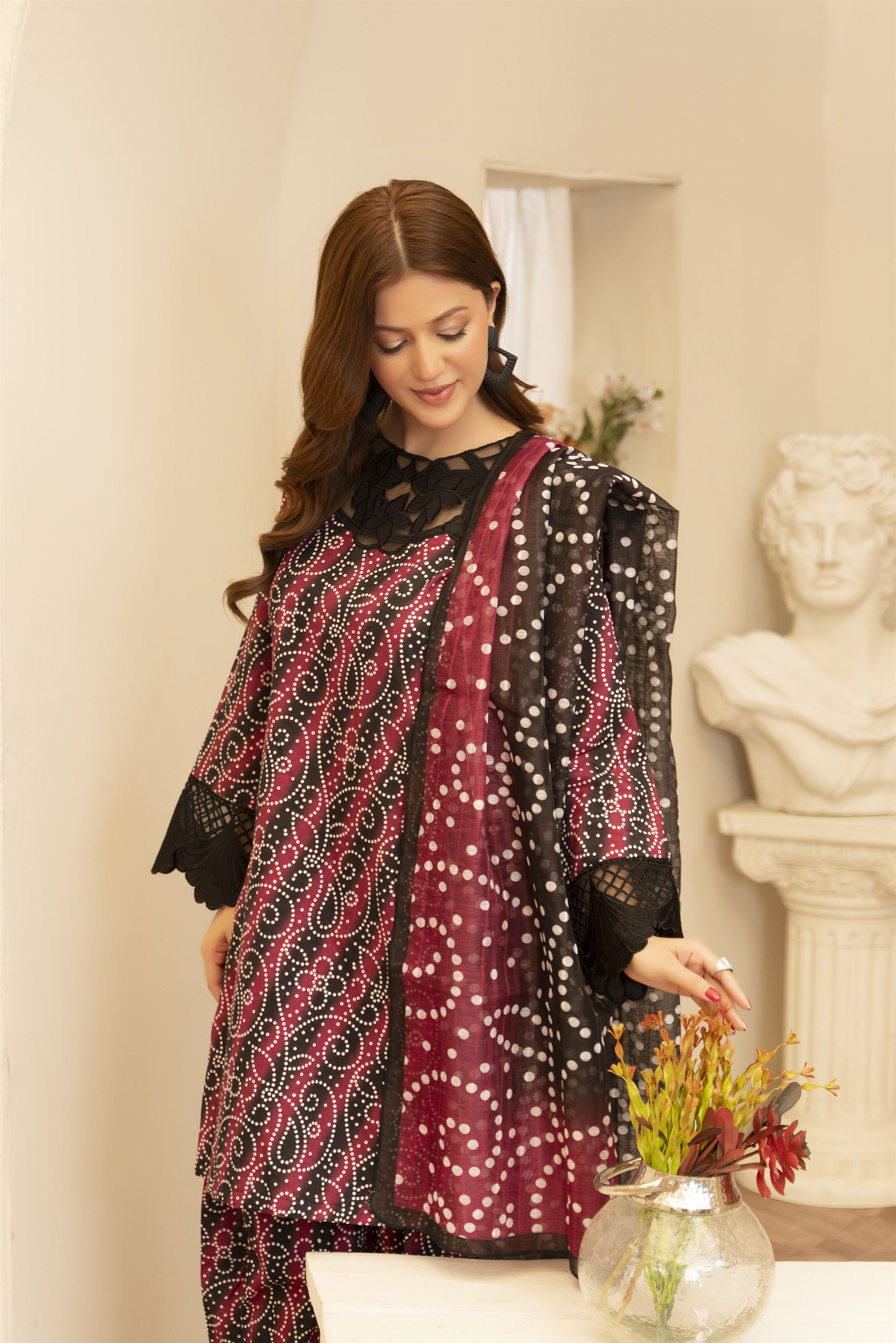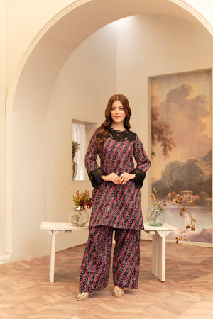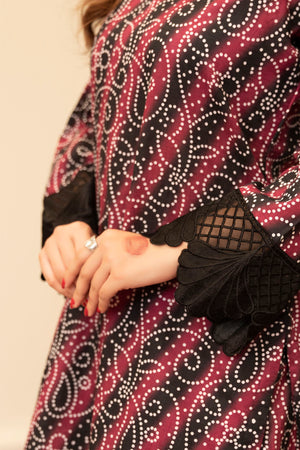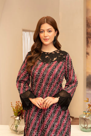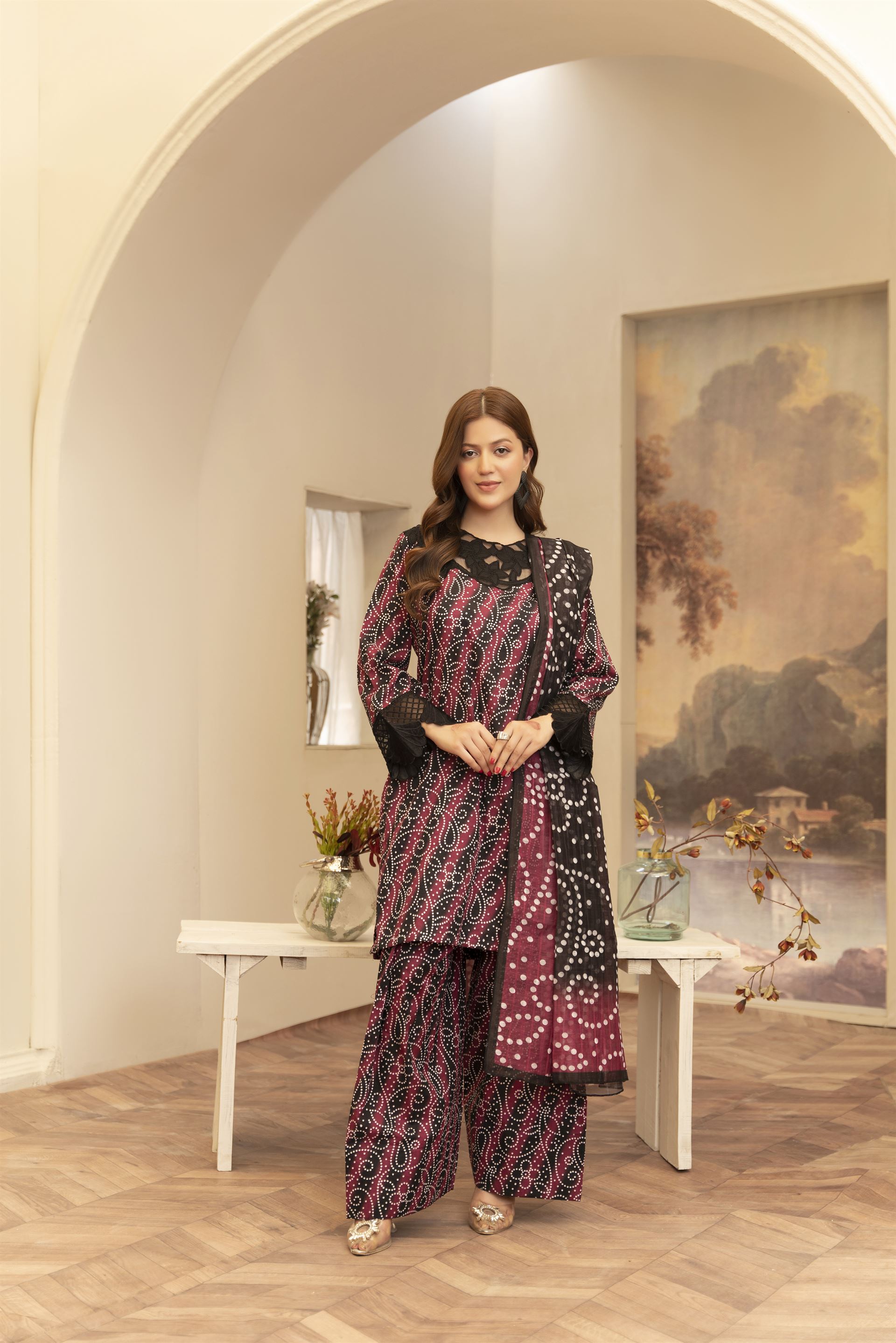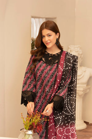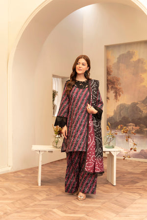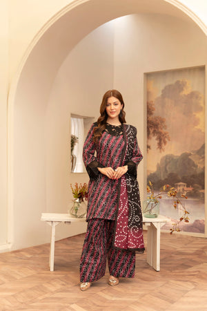 Maysa is a refined 3-piece outfit featuring intricate embroidery and artistic printwork. Paired with a traditional farshi shalwar, it offers a timeless and elegant look for any special occasion.