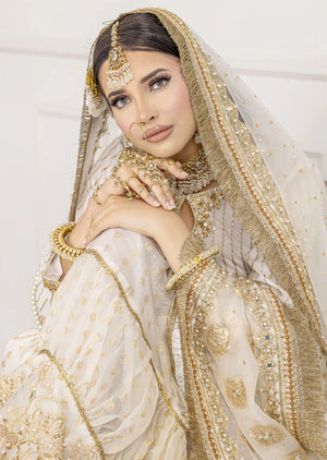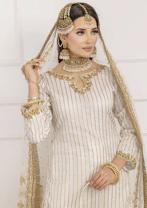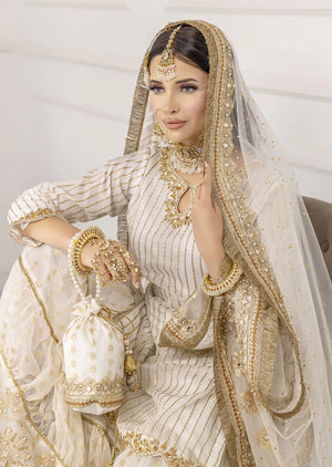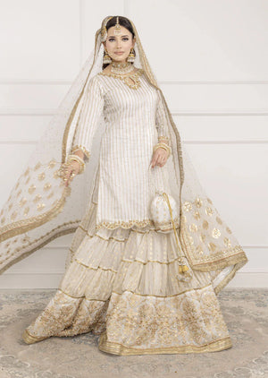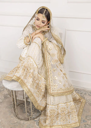 Embrace ethereal elegance with this off-white designer ensemble, meticulously crafted to perfection. The kameez features exquisite embroidery, showcasing delicate handwork that exudes timeless charm. It is beautifully paired with a brochia-embroidered gharara, adding a royal touch to your look, and a four-sided embroidered dupatta that completes the outfit with sheer sophistication.