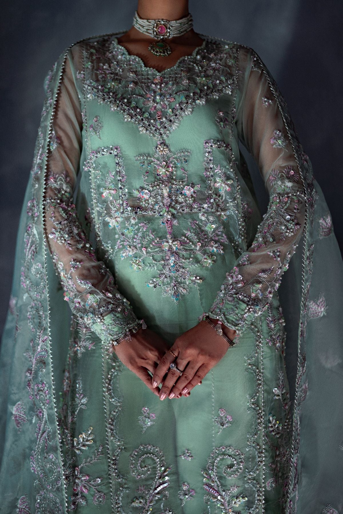 1. Embroidered & Hand Embellished Front Center Panel (Organza) – 1Pcs