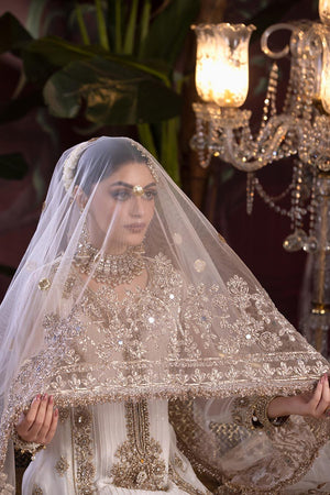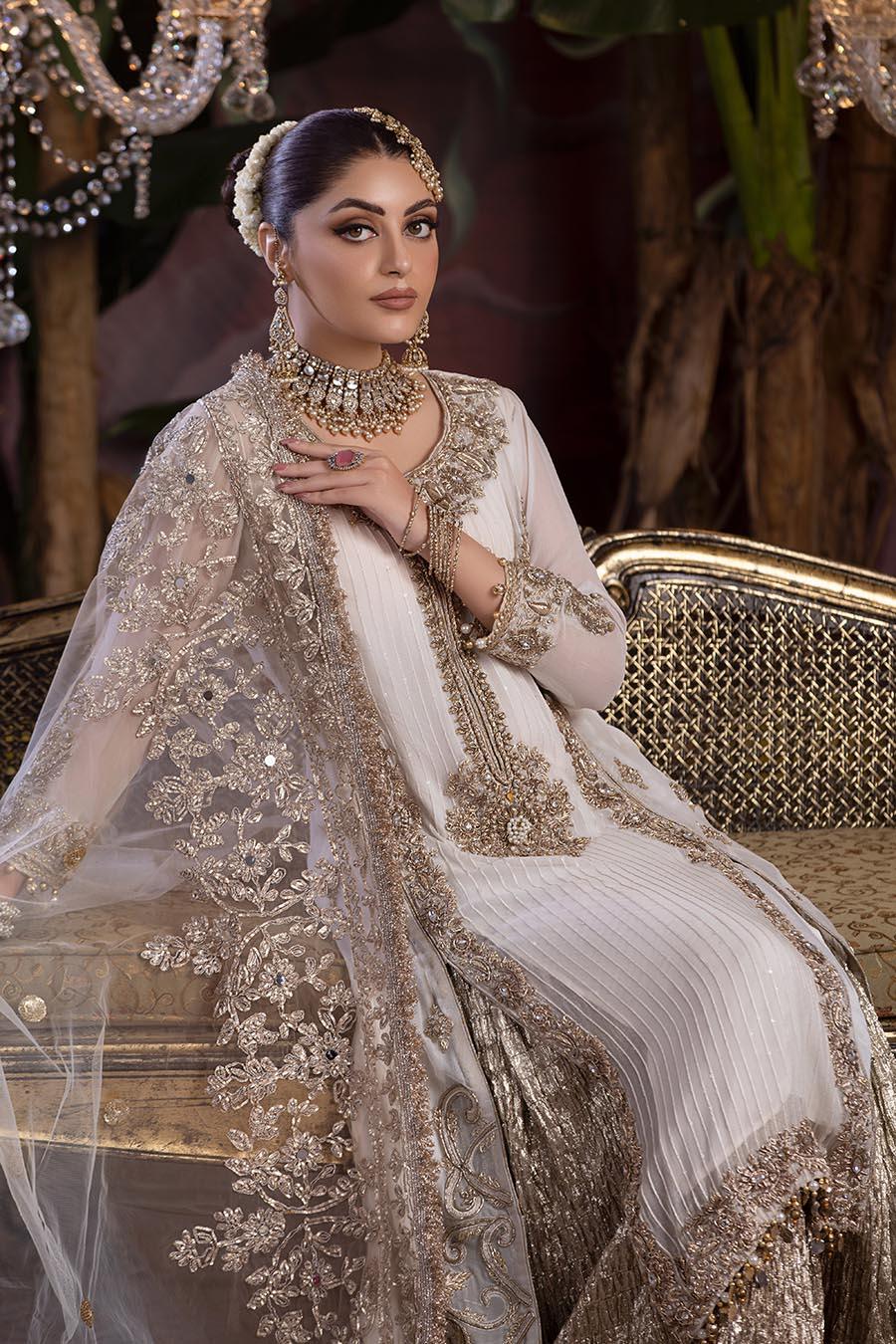 A symphony of grace unfolds in this ensemble. The Pure Crinkle Chiffon shirt, adorned with delicate Kora, Dabka, and Stones embroidery, exudes timeless allure. Its Net Dupatta, graced by Tilla work, trails like a silken breeze. And behold the flowing Crushed Silk Sharara.
