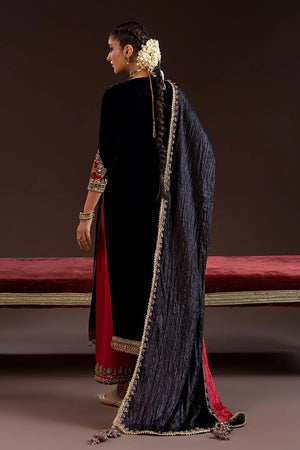 Shirt: Velvet (imported) with Kora, Dabka, and Zardozi work (Hand-embroidered)