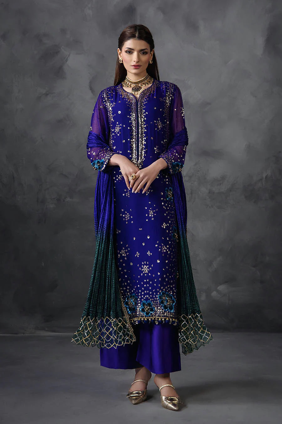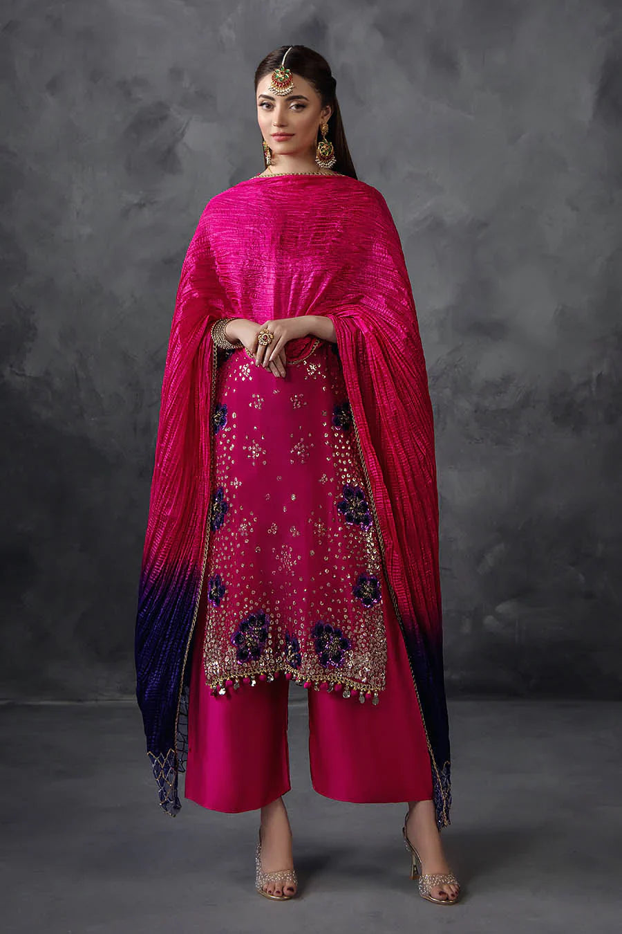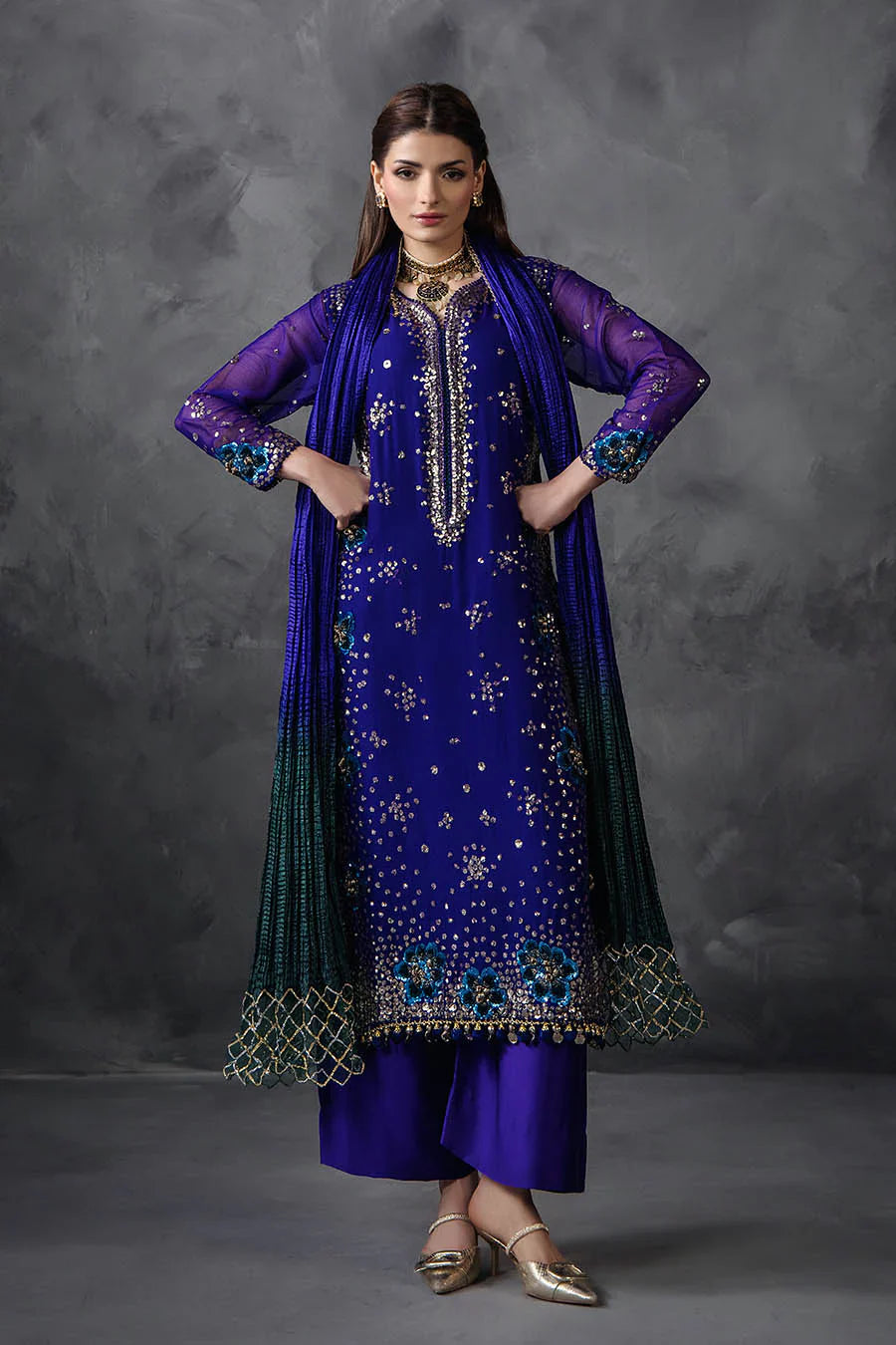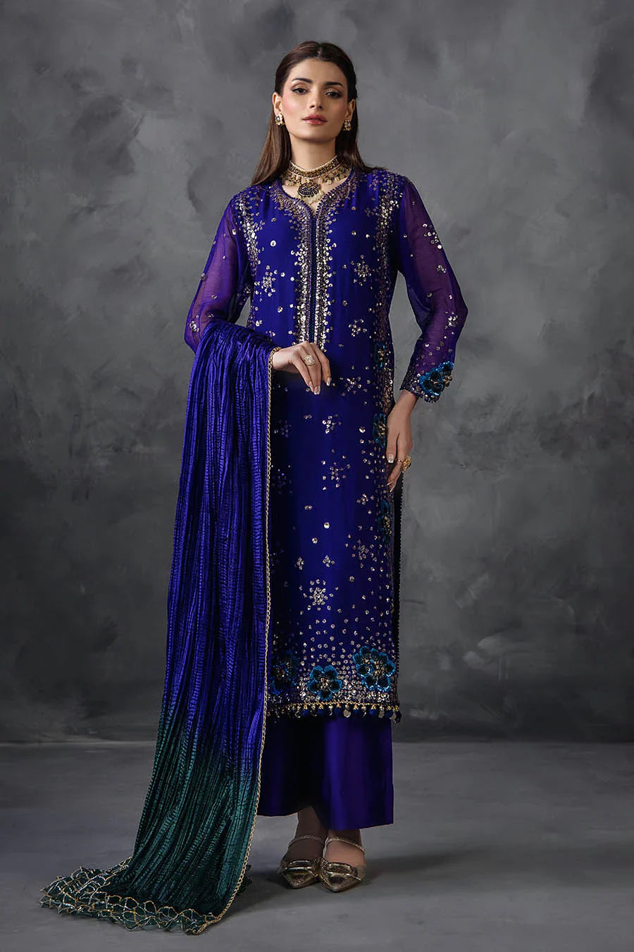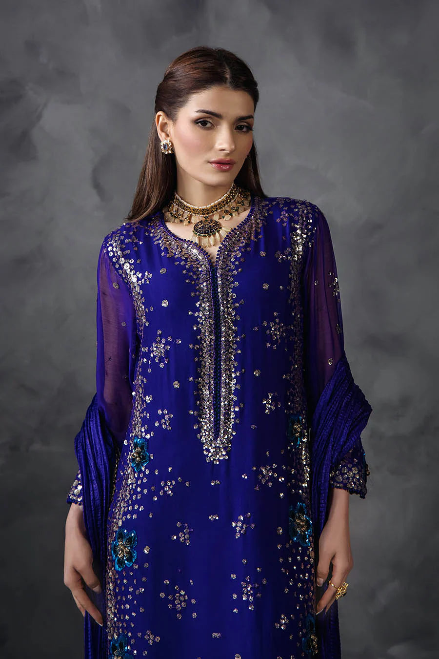 Shirt: Crinkle Chiffon (Embellished with Gotta n Sequins along with Velvet 3d flowers)