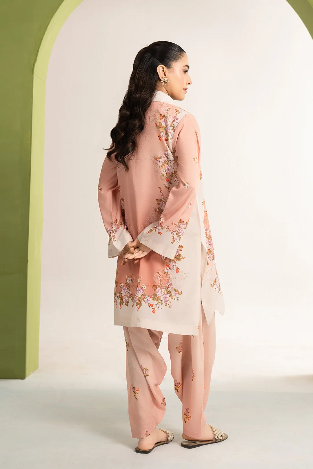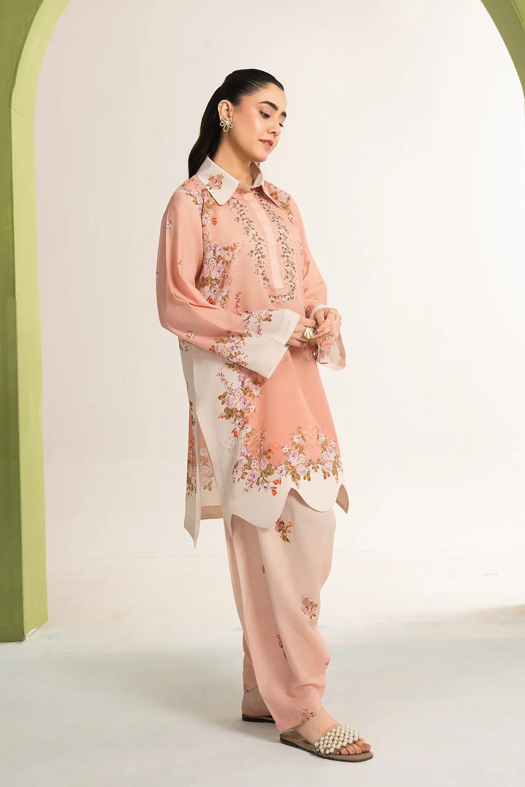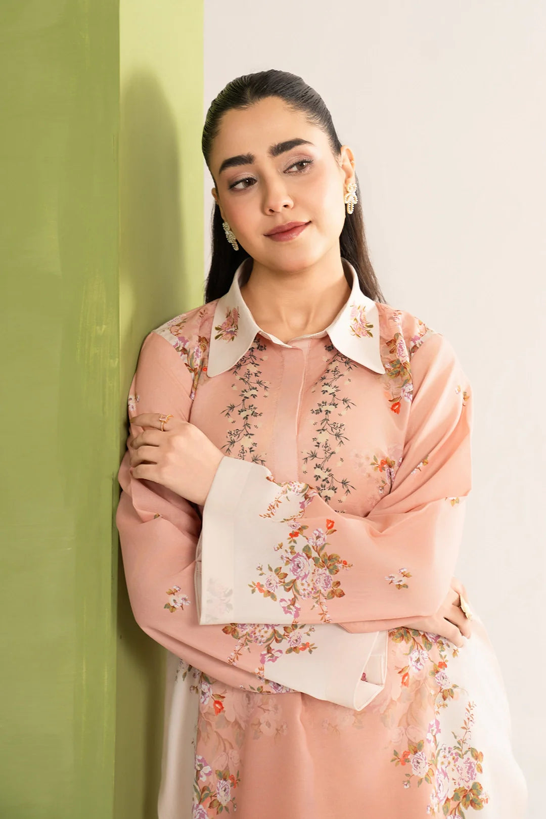 Soft blush tones layered with delicate florals, creating a look that feels light, graceful,