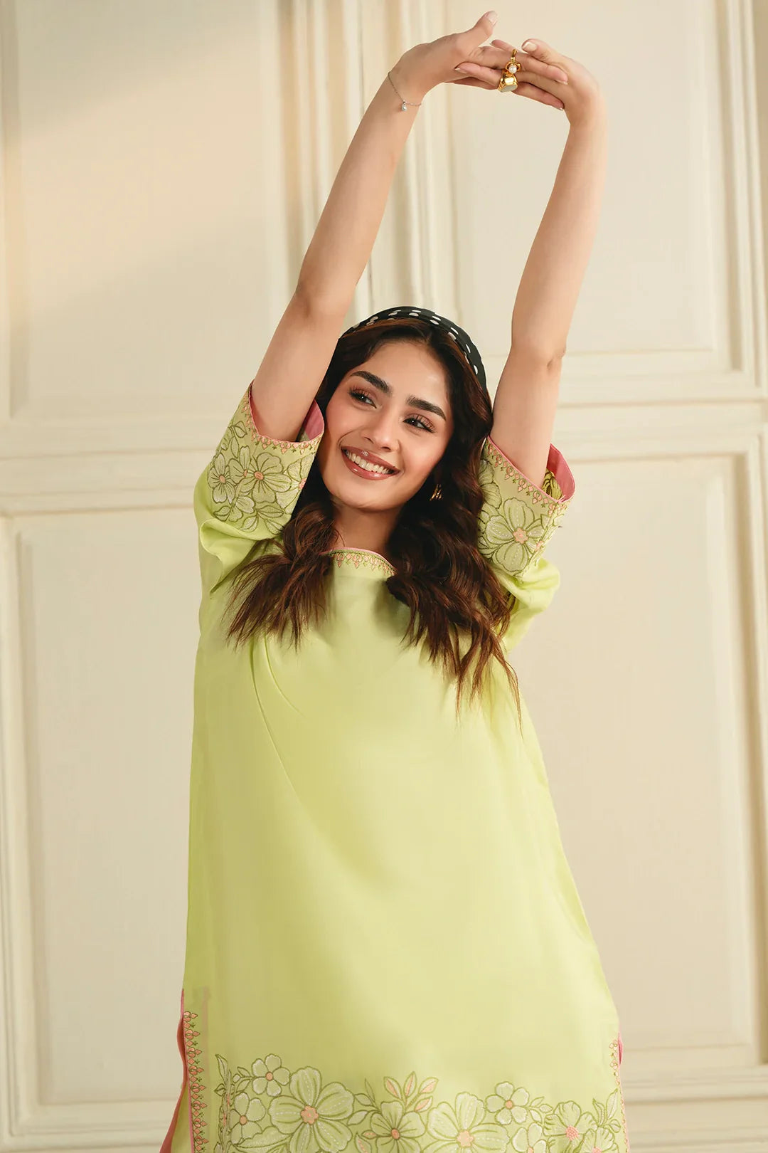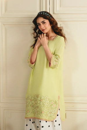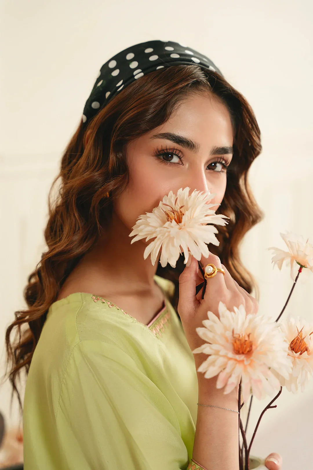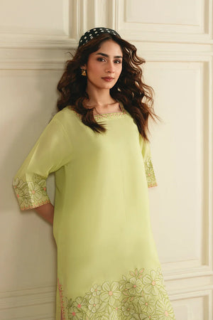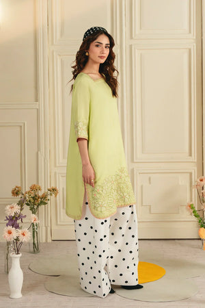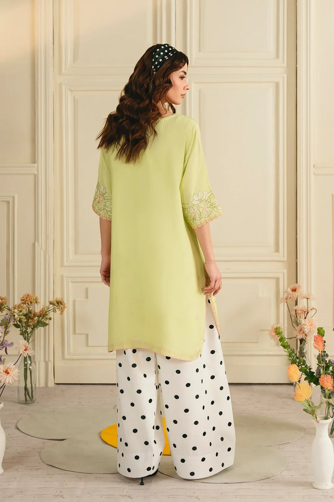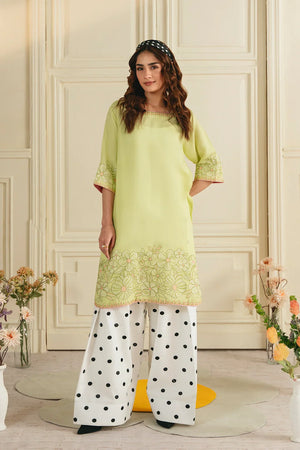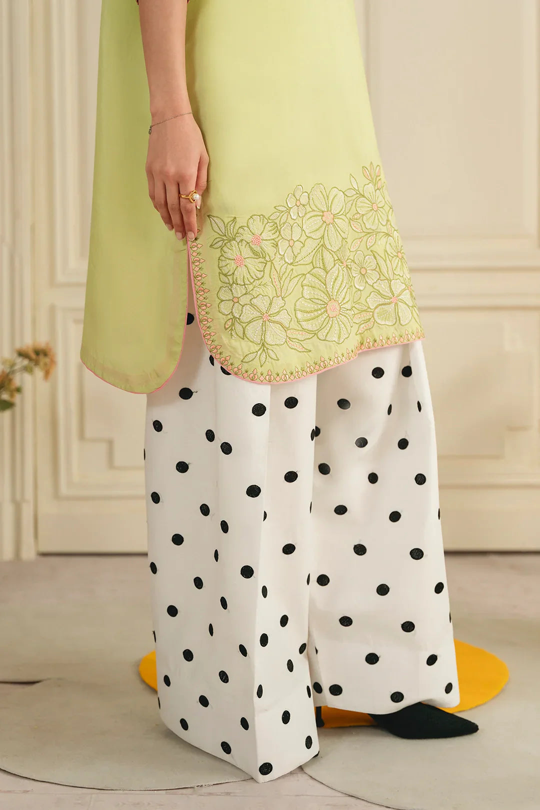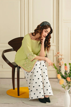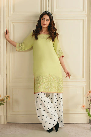 • A refined two-piece ensemble featuring a short shirt with delicately embroidered hem, embroidered short sleeves, and a modern square neckline, paired with a polka-dot embroidered farshi shalwar for a graceful statement look.